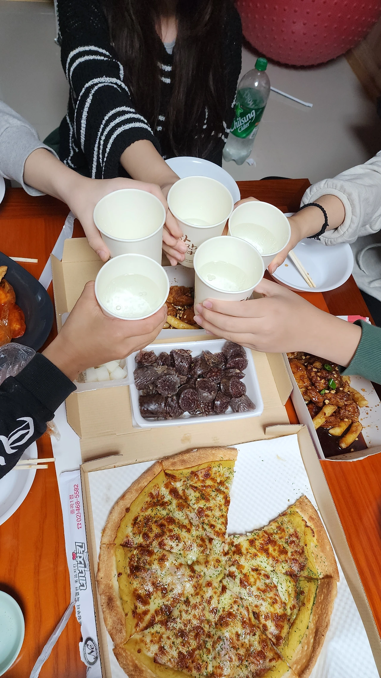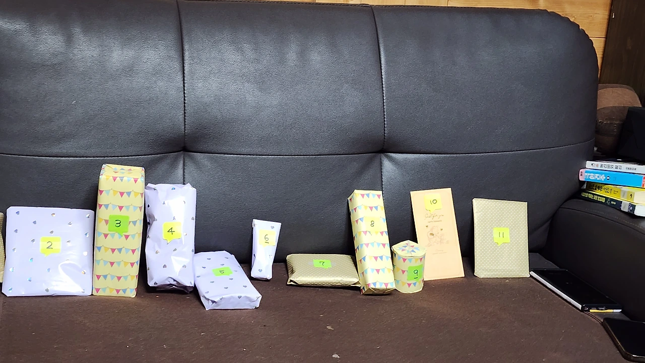 난 메모지, 남편은 치약, 첫째는 뜨개수세미, 둘째는 내가 좋아하는 약과다. 모두가 한바탕 웃고 즐겼다.