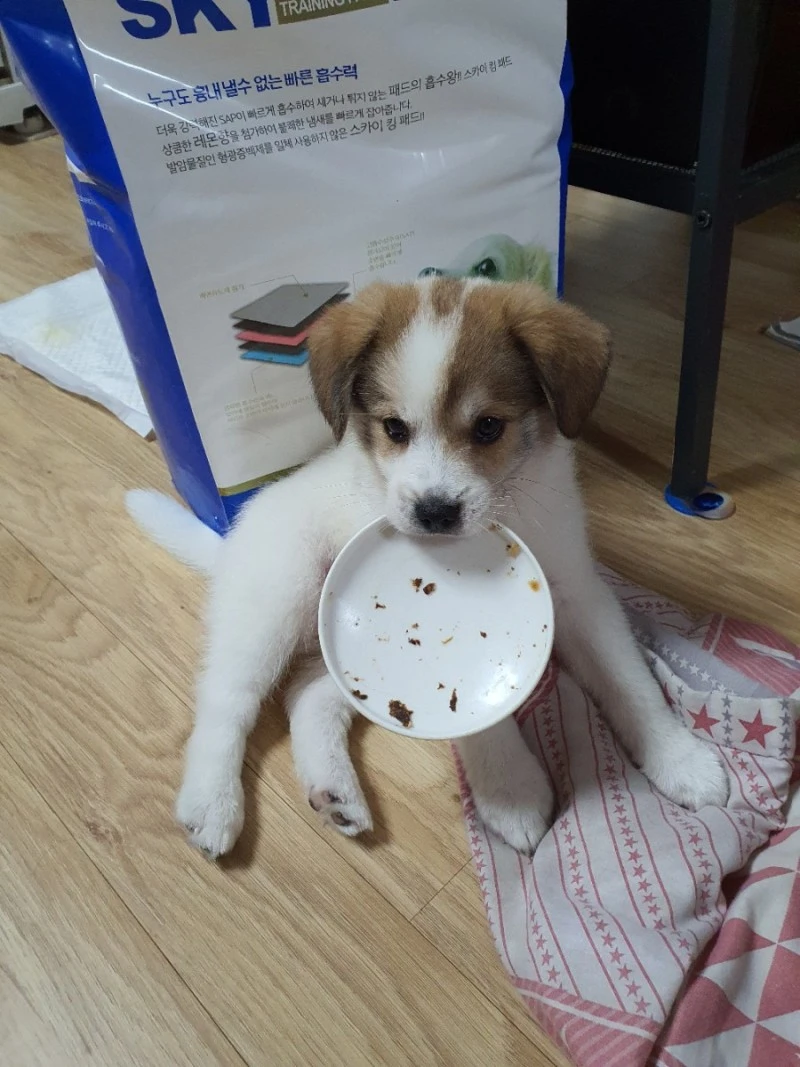 우유는 자기를 예뻐하는 둘째를 총총총 따라다니며 꼬리를 살랑살랑 흔들다 무릎에서 잠들곤했다. 그모습에 절로 흐믓해지는건 아이만이 아니였기에 책임감도 느껴지면서 두달이 넘어가는 지금에서 우린 아직도 적응하며 맞춰살고 있는 중이다. 다행히 우유는 대, 소변을 처음보단 실수가 줄어들고 있고, 훈련을 통한 교감도 잘해주는 편이라 사랑스러움 그자체로 함께 하고 있다.