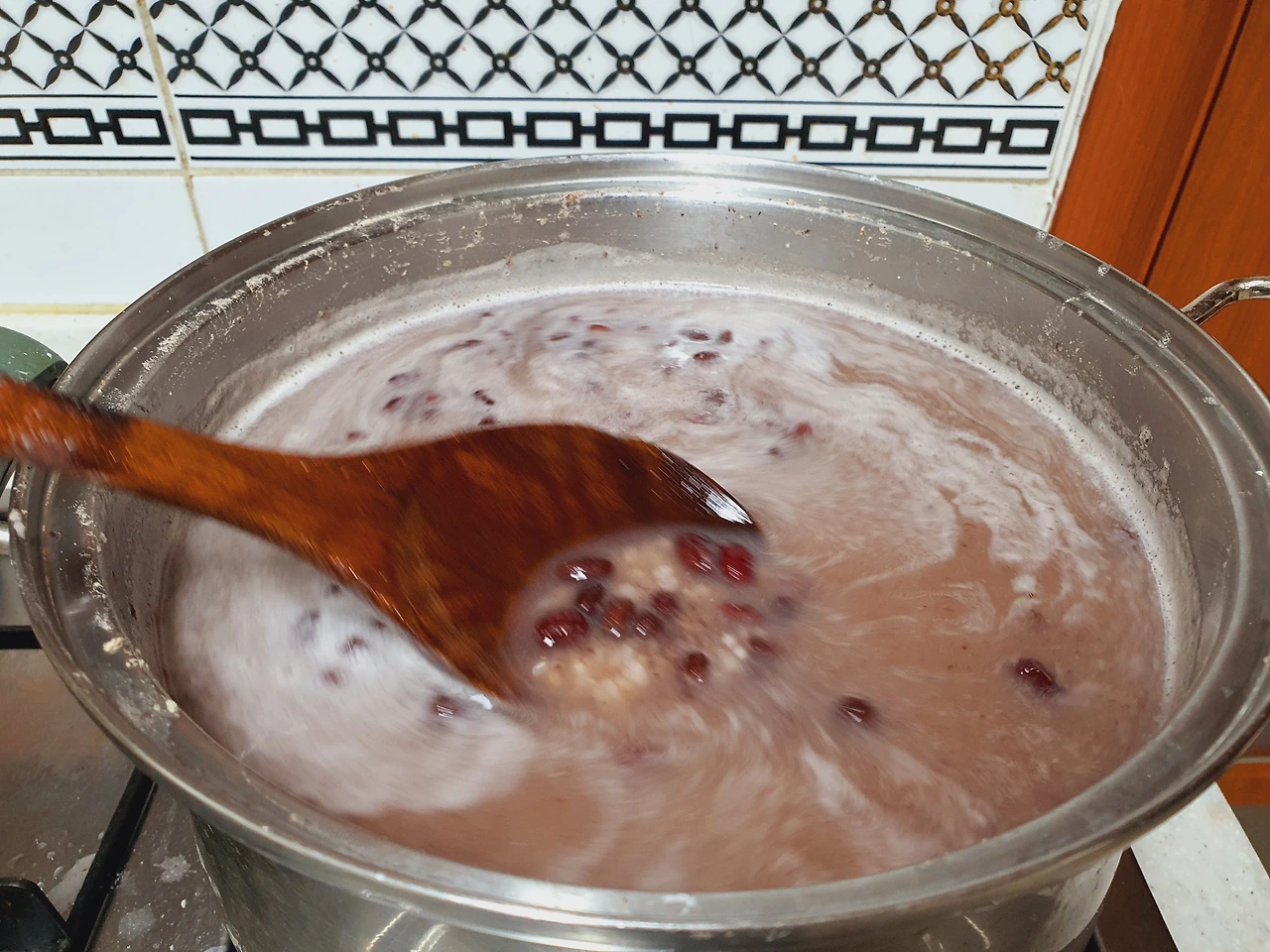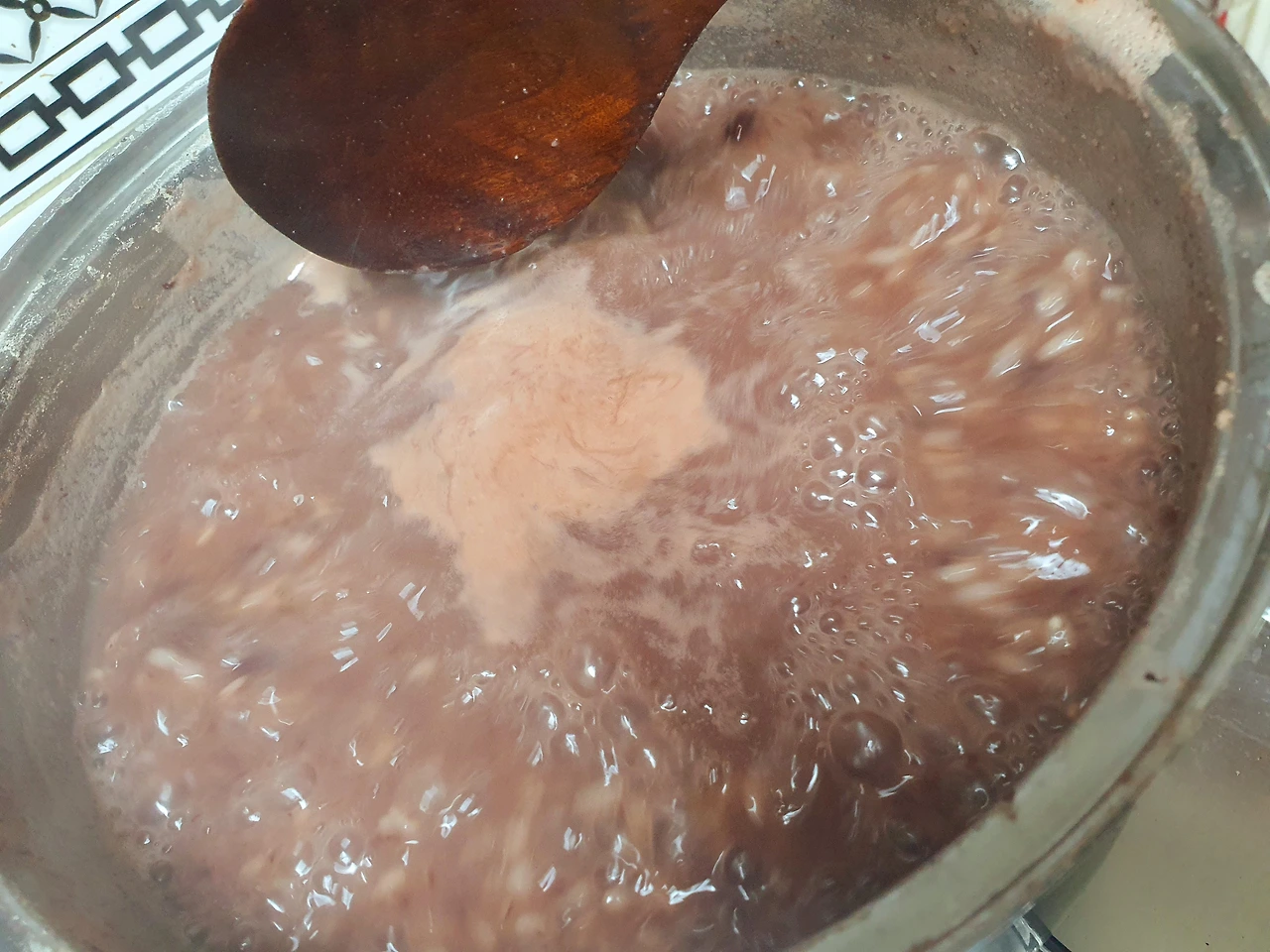 통팥과 멥쌀을 넣고, 거품도 걷어주고