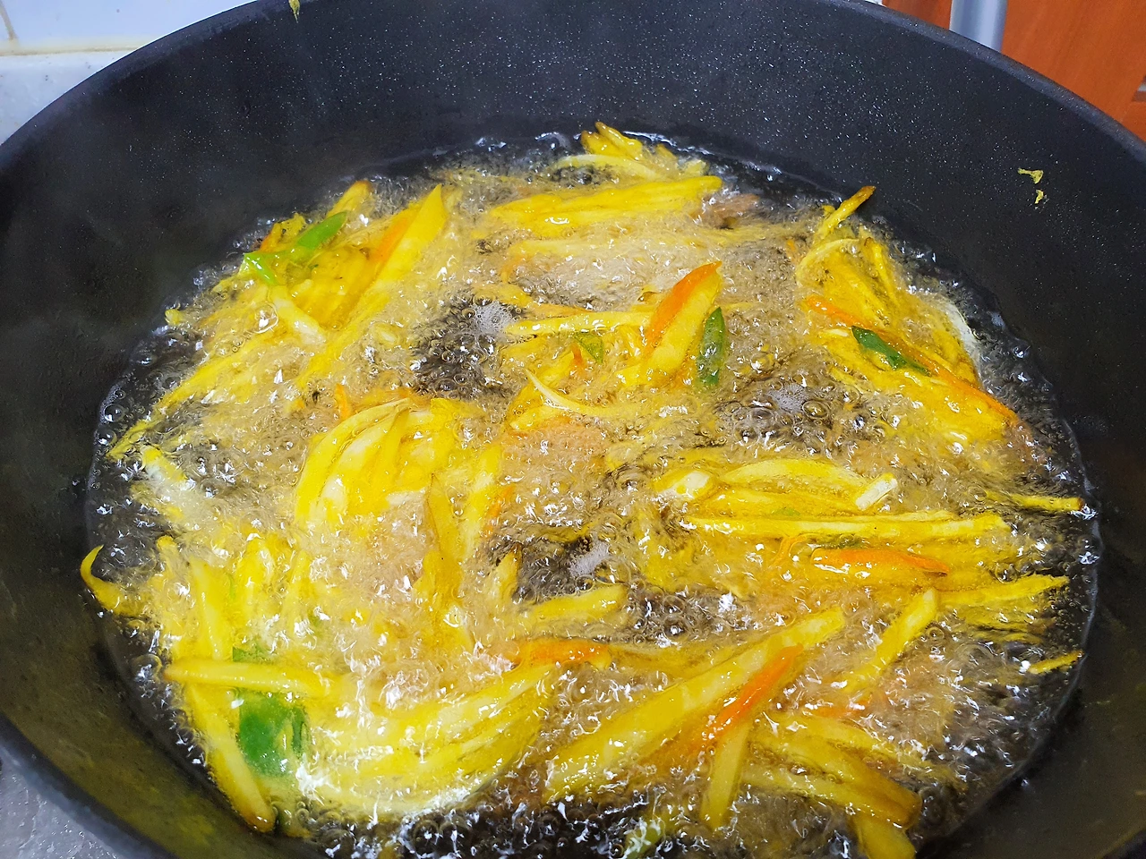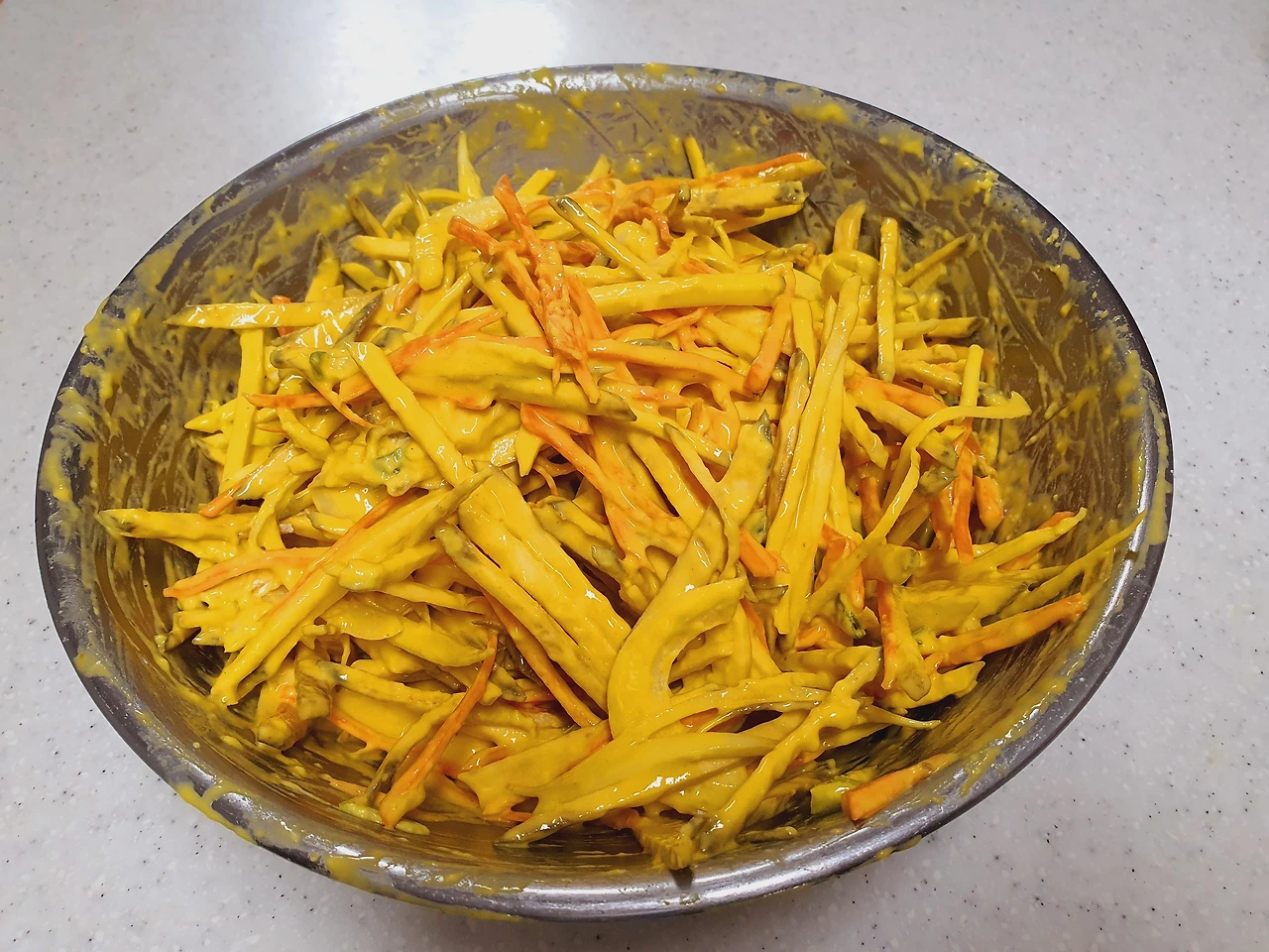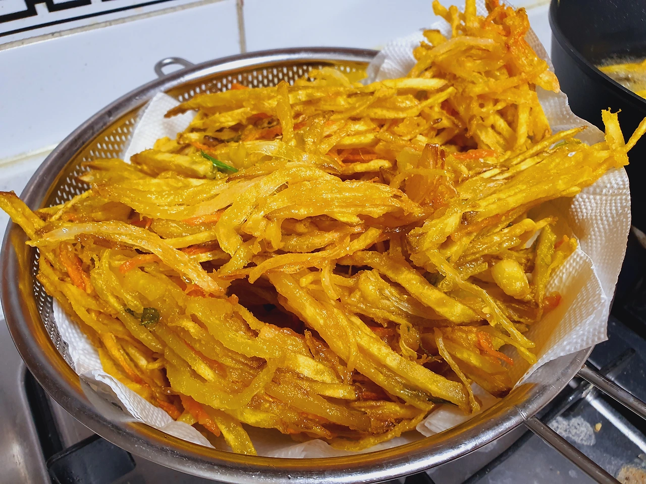 치자물은 노란 색을 띠며 튀기기도 전부터 색깔이 맛을 다했다. 내심 기분 좋게 기름 한통 다 붓고 기름 온도가 올라가기 기다렸다가 튀겼다. 시작은 좋았으나 튀겨지는 모습이 왠지 기름을 먹는 기분이 들게 한다. 부침가루 때문일까? 달라진 거라곤 튀김가루 대신 부침가루였건만 튀겨지는 게 아닌 부쳐지는 기분이 든다. 기름을 한껏 먹은듯한 야채튀김의 비주얼이 맘에 안 든다. 슬슬 불안해지기도 하다. 이미 반죽을 다 해버린 상태인데 말이다. 못 먹어도 다 튀겨야 한다.