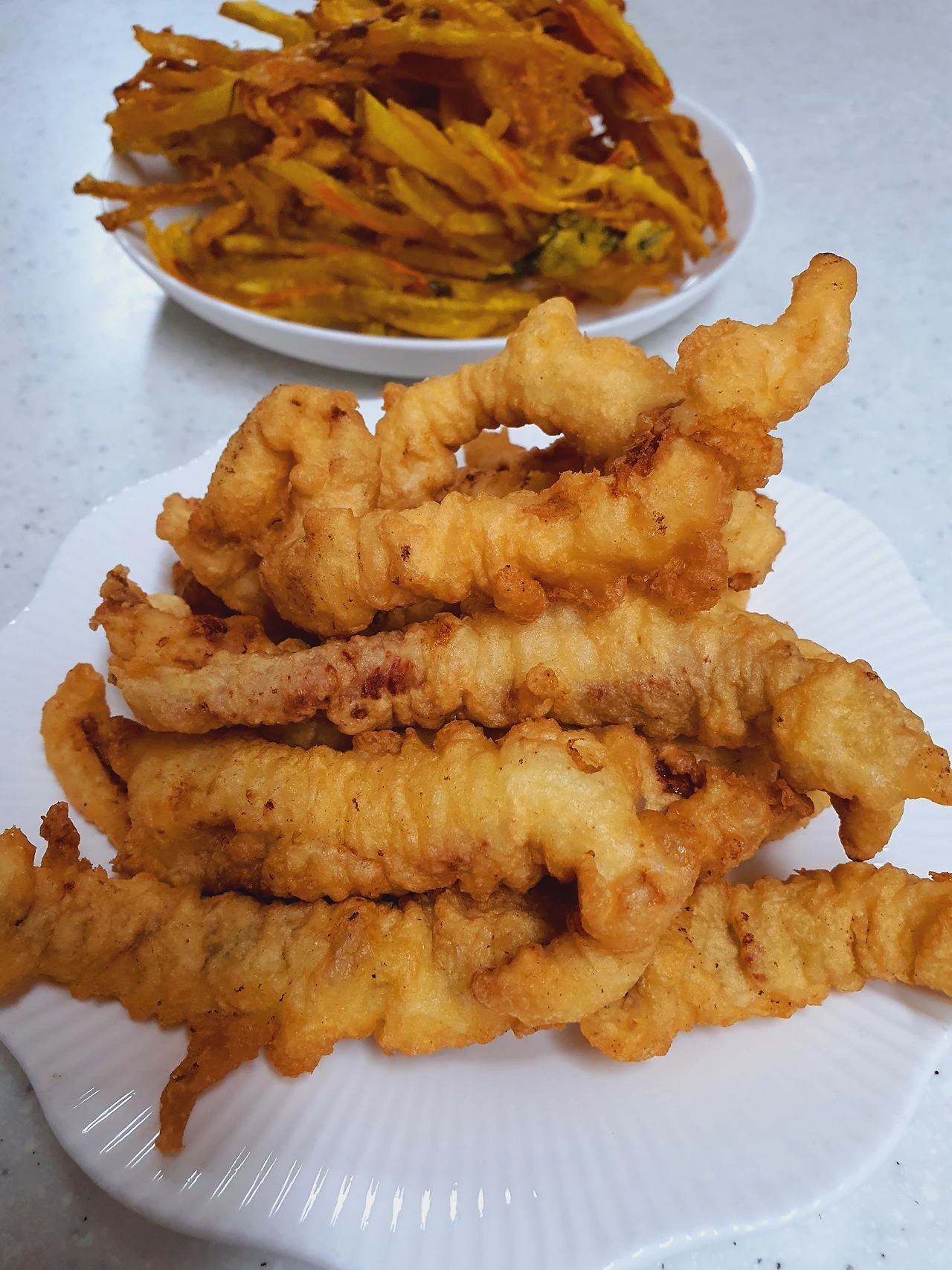 사실 한편에 오징어도 튀길 준비를 마친 상태였다. 오늘 운동화도 튀길수 있는 전투력이였다. 튀길 때 한 번에 튀겨보자란 생각에 오징어도 썰어 물기 빼고 있었는데 이대론 불안해서 튀김가루를 준비해야 했다. 약간의 전투력이 상실되는 순간이였다. 둘째에게 심부름을 시키는 동안 야채튀김을 두 번 튀긴다. 애벌 튀김을 하고 한번 더 튀겨내니 바삭한 느낌의 야채튀김이 나온듯하다. 고맙게도 둘째가 사 온 튀김가루에 오징어 반죽 튀김을 준비한다. 물기 빼고 밀가루를 입힌 오징어에 튀김 반죽을 퐁당!