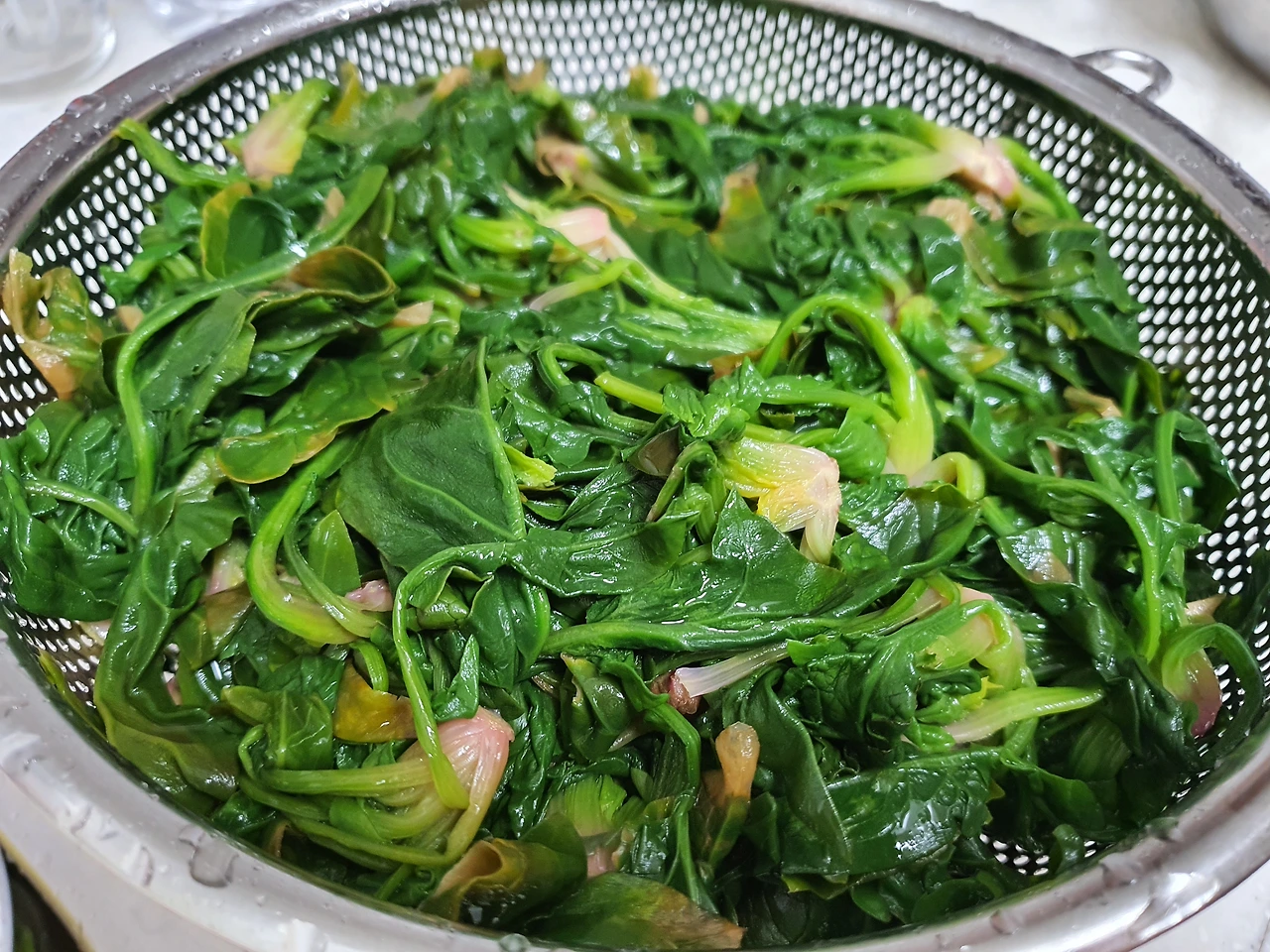 시금치를 보는순간 아버님의 모습이 눈앞에 그려진다. 냄비에 물을 올리고 시금치를 데칠 준비를 했다. 팔팔 끓는 물에 시금치는 더욱 선명해졌고 달달함을 상상하며 한줄기를 잡아 올렸다. 찬물에 헹구어 맛을 보는순간 분홍빛 뿌리에서 느껴지는 달달함에 나도 모르게 끄덕끄덕 거리고 있었다. '아무런 양념을 안해도 이렇게 맛있을수가 있나?' 혼자 중얼거리며 간장과 참기름으로 양념하여 통깨를 솔솔 뿌렸다.