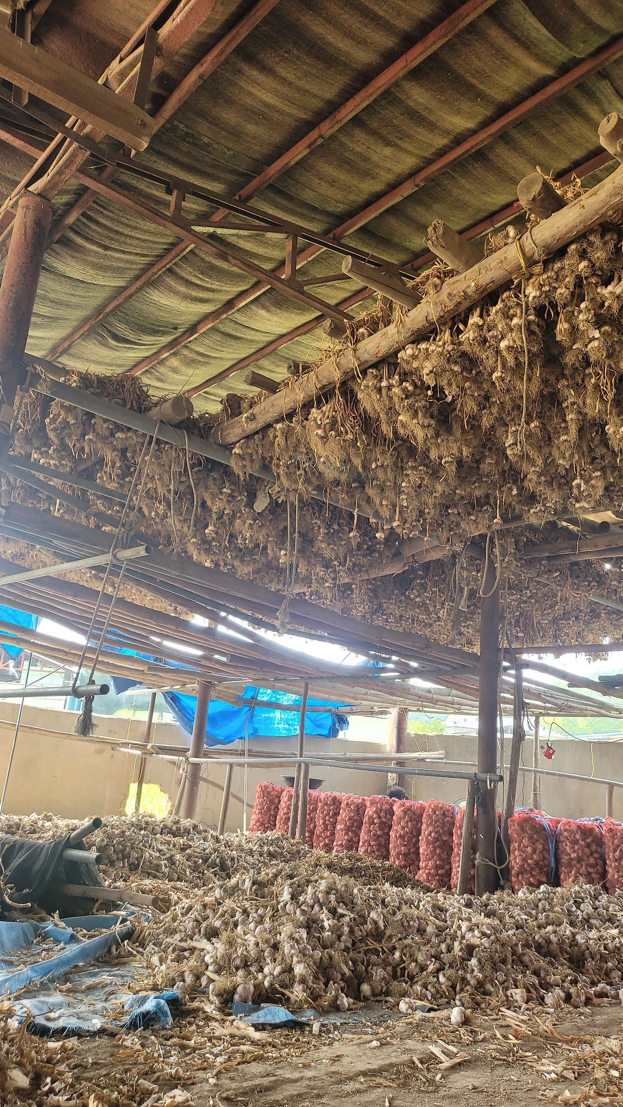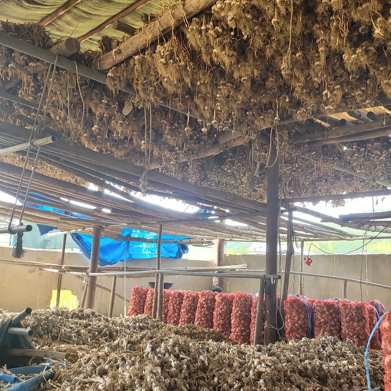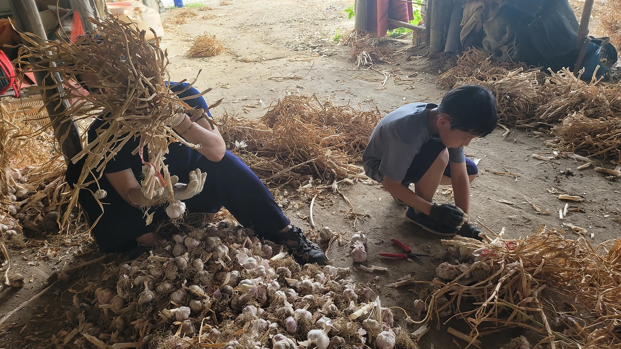 지난번 마늘캐고 건조를 위해 걸어두었던 마늘들을 다시 내려 마늘대가리를 잘라야 한다. 잘려진 마늘은 크기 별로 선별하여 망에 담고 수매에 나선다.