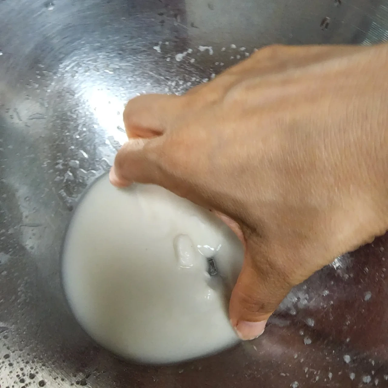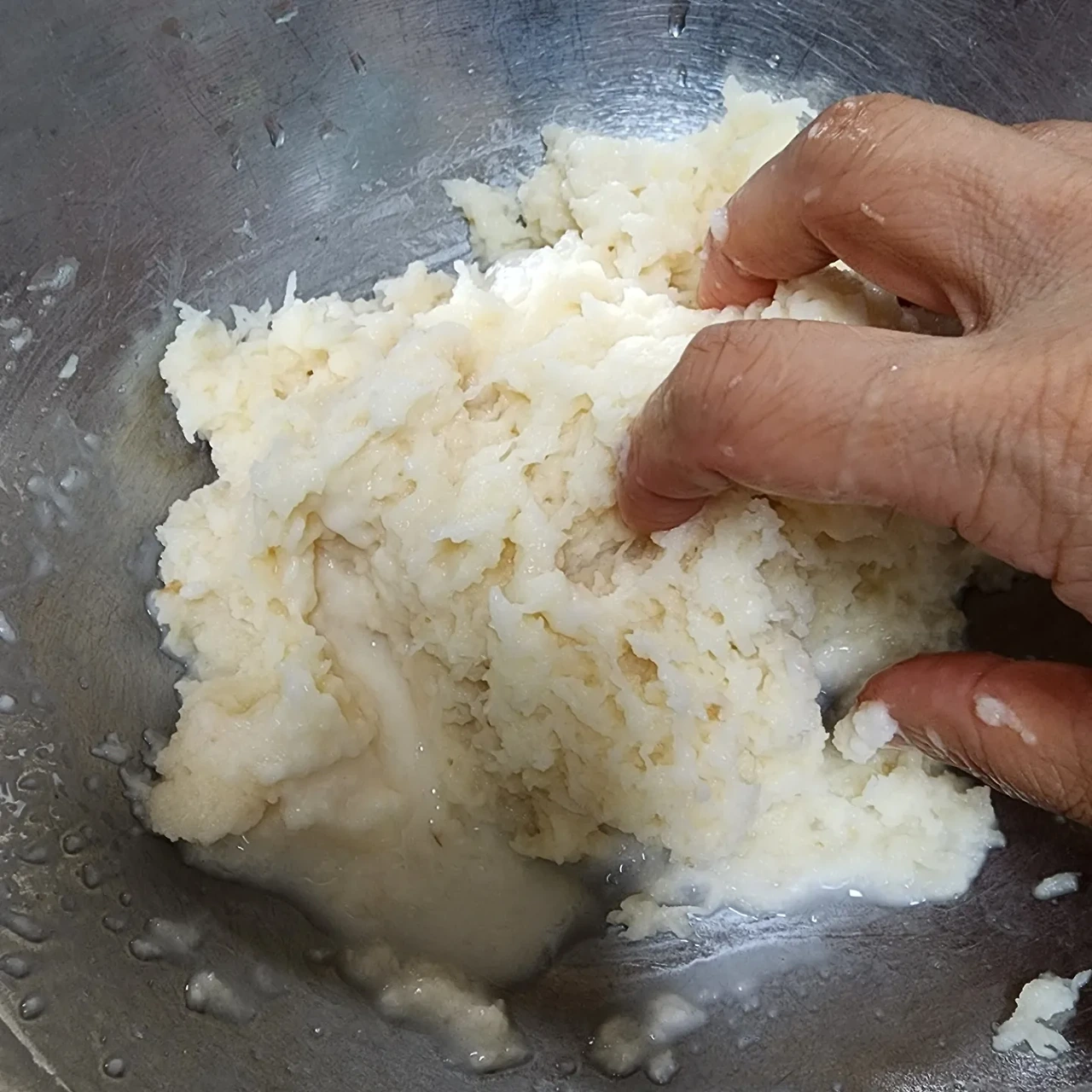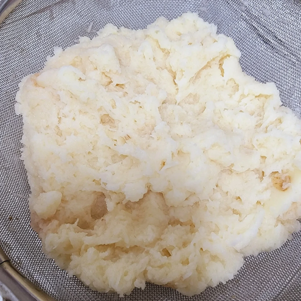 속살을 하얗게 드러낸 감자는 곧이어 나무로 된 수제 강판에 갈리기 시작한다. 강판은 아버지께서 직접 만드신걸로 일일이 못으로 구멍을 내셨다. 얇은 철판에 구멍을 내고 뒤집어 직사각형의 나무위에 또 못질을 하여 고정한다. 순식간에 근사한 강판이 완성되었다. 새로 만든 강판은 쓱쓱 몇번에 커다란 감자가 순식간에 갈린다. 성능이 좋다는 말이다. 그만큼 조심도 해야한다. 잠깐 삐끗하는 순간 손도 갈린다.