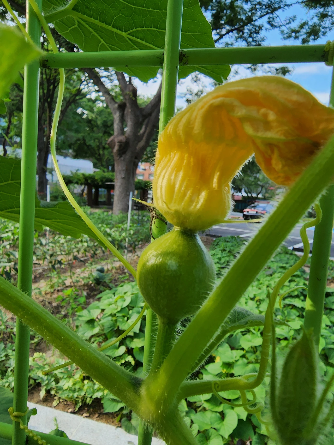 호박줄기에 시선을 쫓다 중간쯤 노오란 호박꽃에서 시선을 멈췄다. 호박꽃 아래 반질반질 매끈한 새끼호박이 보인다. 장맛비가 주춤한 사이 땅속의 영양분을 쭈욱 빨아들여 커보겠다는 의지가 강해보이는 씩씩한 새끼호박이였다.