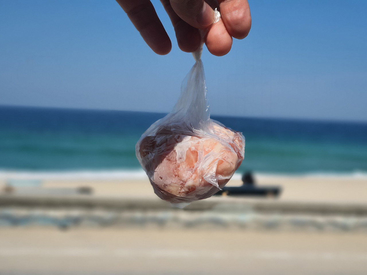 아침 일찍도 배달된 냉동 닭다리 살을 ‘적당히’ 해동시켰다. 너무 녹아도 자르기 힘들기 때문에 그 적당함은 무던히도 잘 손질할 수 있는 가장 중요한 요령이다. 적당히 해동된 냉동 닭다리살을 새끼손톱만 한 크기로 자르고, 70g식 소분했다. 소분된 것은 1회용 비닐봉지에 들어갔다. 가장 작은 비닐봉지지만, 바다를 바라보고 있는 와중에 그 위를 둥둥 떠다닐 수도 있을 플라스틱 쓰레기를 생각하니 괜히 죄책감이 들었다. 차곡차곡 쌓아 냉동고에 넣는다. 그리고 200g 정도 남겨둔 냉동 닭다리 살을 먹기 좋은 크기고 잘랐다.