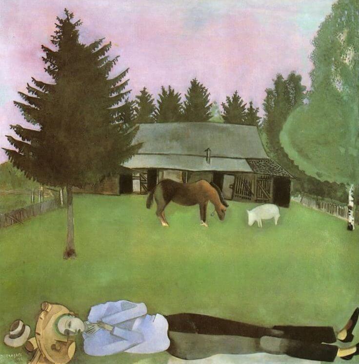 설명: 몽환적인 이미지에 둘러싸인 시인의 모습을 몽환적으로 표현한 샤갈의 작품은 그리움의 본질과 창작의 과정을 포착하여 김광석의 노래에 담긴 서정적이고 감성적인 깊이를 반영합니다.