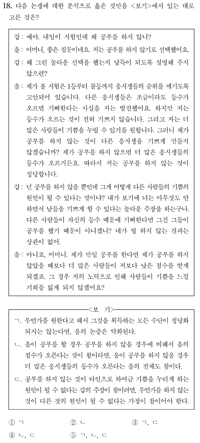 그런 결정은 아무리 출제자라고 해도 손쉽게 할 수 없는 것이다. 좋은 문제가 되려면 그러한 가능성들이 가급적 상식적인 수준에서, 분산되지 않도록 충분한 배경지식과 맥락을 제공해줘야 한다. 하지만 상식이란 사람마다 다른 것이고, 객관식 선택형으로 정립될 수 없는 것이 대부분이다. 어디까지가 상식인가? 누군가는 중학교, 고등학교 수준, 혹은 대학 졸업생 수준이라고 말하기도 하지만, 상식은 단순한 지식들의 목록이 아니고 특정한 관점과 윤리, 세계관들이 뒤섞여 있는 것이다. 결국 가장 근본적인 문제는 귀납적인 논증 문제를 어떻게든 객관식 선택형 형식으로 끼워맞추려는 구조라고 생각한다. 밀의 '위해 원칙'과 병역 기피 문제를 둘러싼 사고력을 묻고 싶으면, 그러한 관점에서 서술형 문제를 내거나 면접을 통해 파악할 수 있는 대안적인 방법이 있다. 더 나아가 학생들에게 관심 있는 윤리적, 논쟁적 주제가 뭔지 묻고, 이를 탐구하기 위해 어떤 주도적인 학습을 했는지 실적을 평가할 수도 있다.