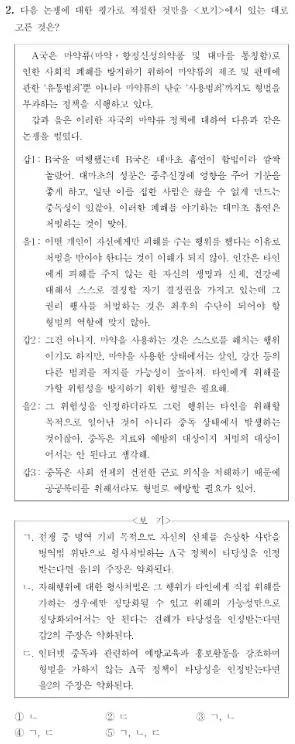 위 사례는 2019년도 추리논증 2번 문제에 유사하게 출제되었는데, 출제자는 이렇게 생각한 것 같다. 전쟁 중이라면 국가의 병력을 충원하기 위한 일정한 부담이 생기고, 국민들은 이를 분담해서 수행할 의무가 있으며, 자기 신체를 손상해서 열외가 되면 군대의 전투력이 약화되고 다른 병사의 부담분이 늘어나게 되므로, 이는 타인에게 피해를 준다고 말할 수 있다. 따라서 A의 입장에서도 민수는 처벌되어야 한다고 말할 수 있다. (혹은 처벌하는 정책의 타당성이 인정된다면 A의 입장은 약화된다.)