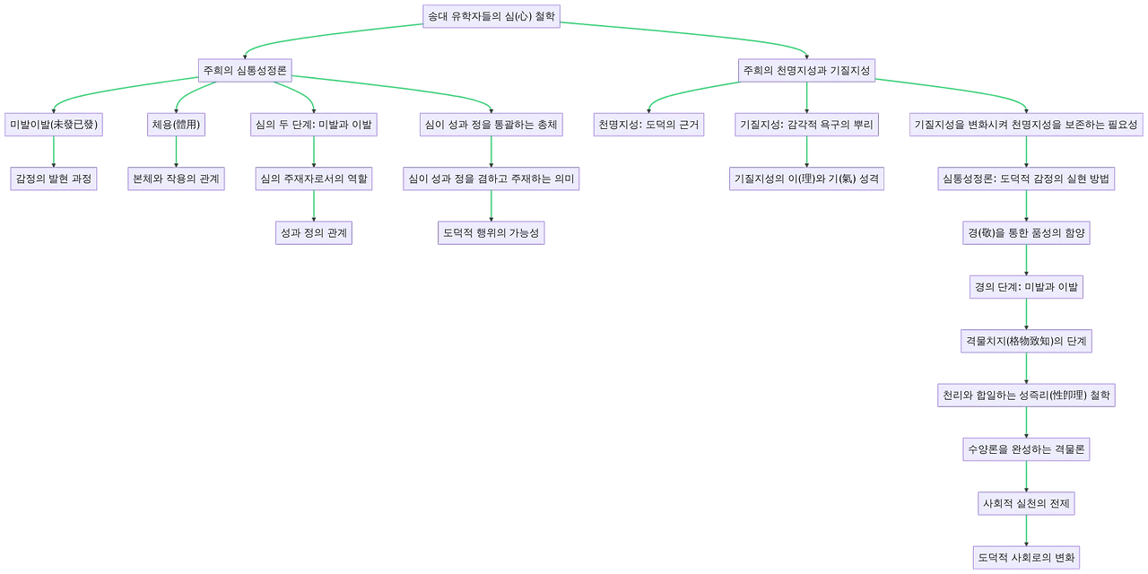 이 다이어그램은 송대 유학자들의 심(心) 철학을 시작으로 주희의 심통성정론을 중심으로 구성되어 있습니다. 주희의 심통성정론은 미발이발(未發已發)과 체용(體用)의 개념을 기반으로 하며, 심의 본체와 작용으로 성(性)과 정(情)을 규정합니다. 이를 통해 심이 성과 정을 통괄하는 총체라는 개념을 제시하였습니다. 심이 성과 정을 겸하고 주재하는 두 가지 의미를 통해 천명지성과 기질지성의 개념을 도입하였고, 이를 통해 본성을 발휘하여 도덕적 감정을 실현하는 방법을 제시하였습니다. 이는 경(敬)을 통한 품성의 함양과 격물치지(格物致知)의 단계를 통해 이루어집니다. 이러한 과정을 통해 성즉리(性卽理)의 철학을 제시하였고, 이를 사회적 실천의 전제로 삼아 도덕적 사회로의 변화를 추구하였습니다. 이를 위해 주희는 경전의 학습을 통한 격물론을 도입하였고, 이를 통해 도덕의 원리를 탐구하는 지적인 과정을 거쳐 인격 완성을 위한 최종 목표를 설정하였습니다.
