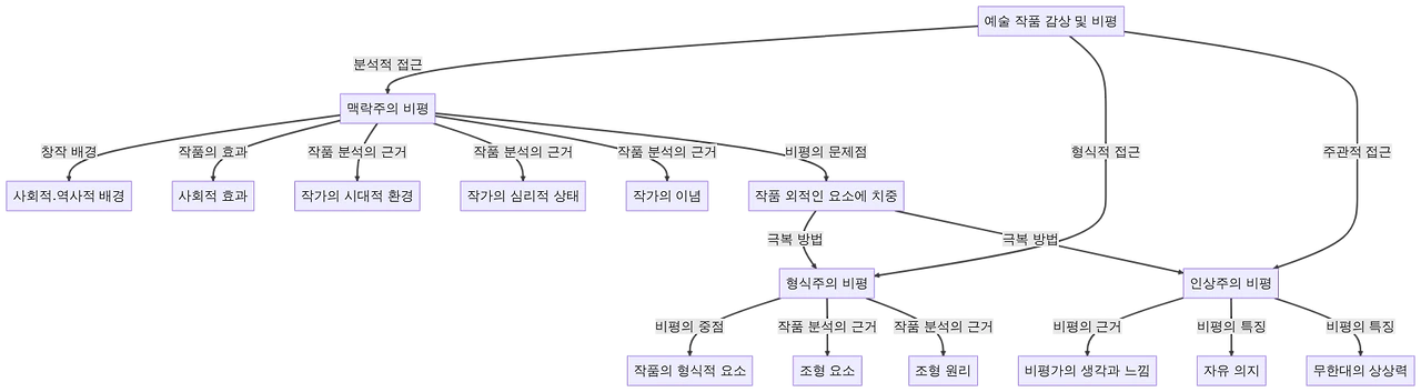 "분석적 접근" --> "맥락주의 비평": 맥락주의 비평은 예술 작품을 분석하는 접근법 중 하나로, 작품이 창작된 사회적․역사적 배경에 주목합니다. 예술가가 살던 시대의 환경, 정치․경제․문화적 상황 등을 고려하며, 작품이 사회에 미치는 영향을 분석하는 데 주력합니다.