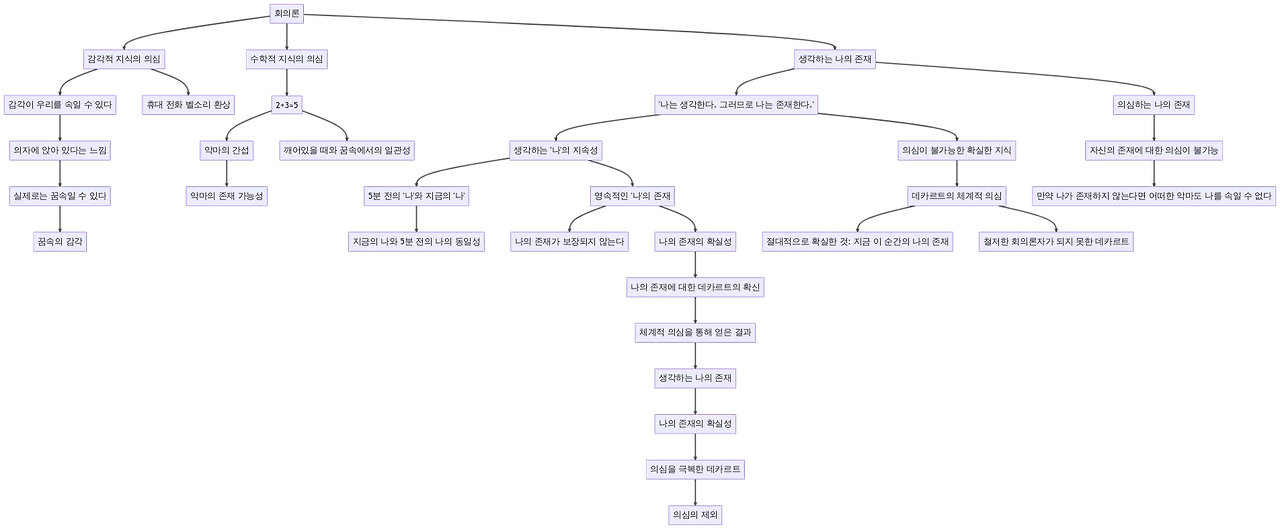 I["생각하는 나의 존재"] --> J["'나는 생각한다. 그러므로 나는 존재한다.'"]