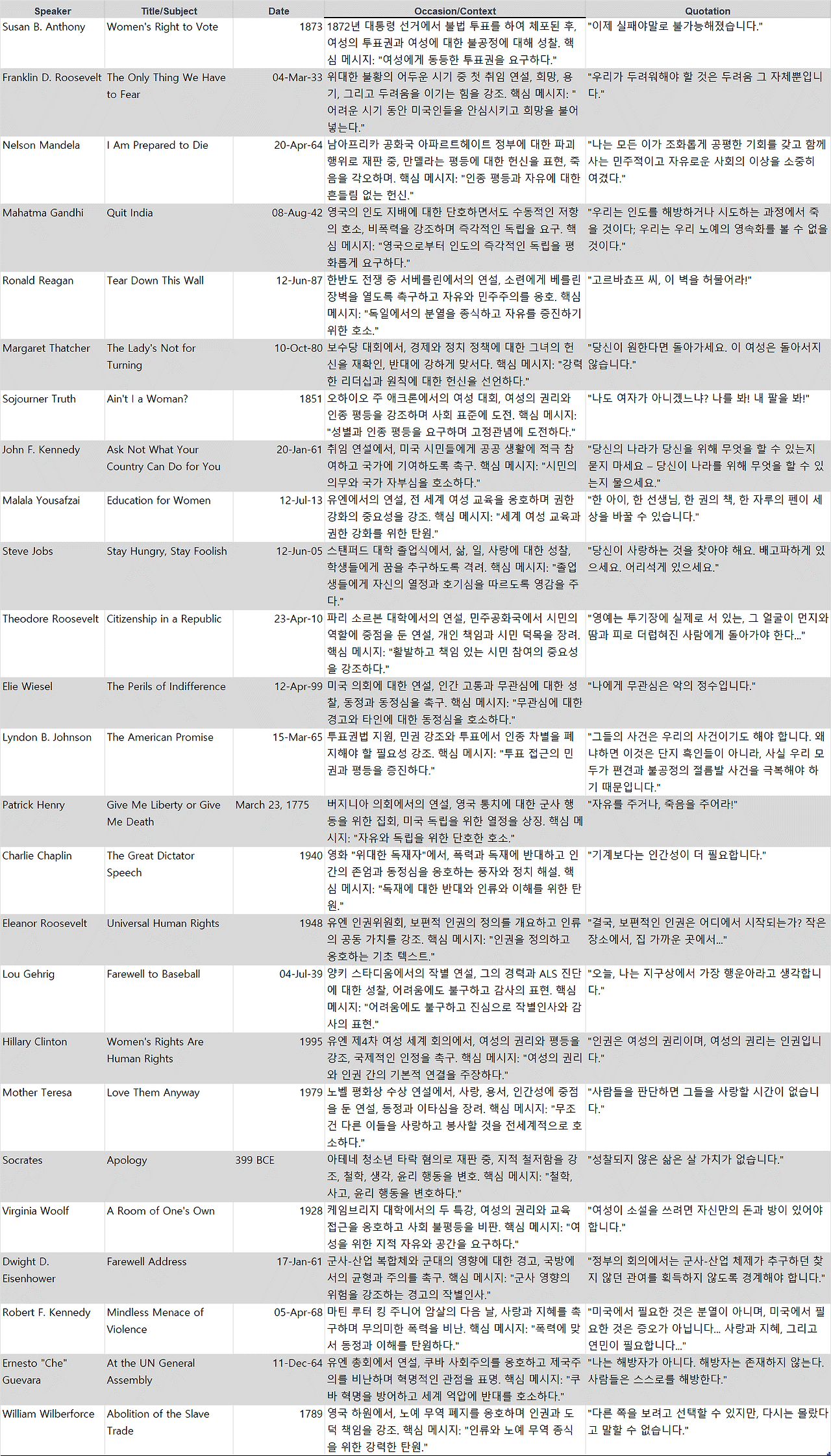 버지니아 울프, 수잔 앤서니, 프랭클린 루즈벨트, 루게릭 등 다양한 사람의 말과 글을 보면서 감동을 느낄 때가 많다. 연설은 말로 이뤄지기도 하지만 글이나 책으로 출판되기도 한다. 위대한 연설에서 감탄하게 되는 포인트는 여러가지가 있을텐데, 일단 강렬하고 창의적인 표현들이 많다. 래퍼들의 펀치라인같은 짜릿한 표현들이 가득하다. 그리고 현대 사회와 비교할 때 느껴지는 유사성과 차이점들이 재미있다. 연설을 할 때 당대 사람들의 불편했을 심기를 상상하면 재밌을 때가 많다. 각 연설에 대해 자세한 분석 글을 쓰기 전에 간략한 목차와 샘플을 작성해보려고 한다. 내가 이 글들을 완수할 수 있으면 좋겠다. 오해를 피하기 위해 미리 말하는데, GPT의 도움을 많이 받았고 내 편향성을 반영한 것은 아니다. 가령 논쟁적인 인물인 체게바라의 연설을 다루는 것은 그 연설이 큰 영향력을 가졌기 때문이고, 내가 그를 지지하기 때문인 것은 아니다. 쿠바 독재정권에 대해 비판도 많고 내가 자세히 아는 것도 아니지만 그럼에도 불구하고 연설문 텍스트 자체를 분석하는 것은 흥미롭기도 하고 필요한 일이라고 생각한다. (연설 실력 자체로 보면 히틀러라는 더 위험한 인물도 있다)