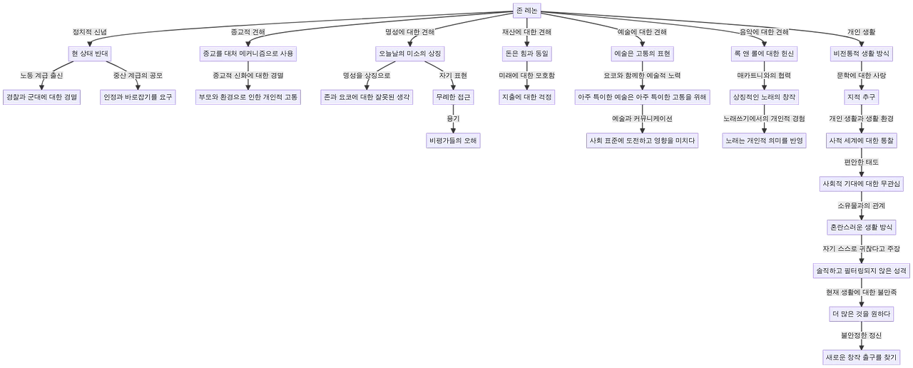 반물질주의: 레논은 부와 명성에 대한 복잡하고 모호한 관점을 가지고 있습니다. 그는 부와 권력에 대한 생각을 공유하면서, 이러한 물질적인 가치에 대한 부정적인 시각도 보였습니다. 그의 이러한 태도는 그가 물질주의보다는 개인적인 성장과 창조성을 중요시한다는 것을 암시합니다. 오노 요코 역시 물질보다는 예술과 창조성에 더 큰 가치를 둔다는 관점을 가지고 있습니다.