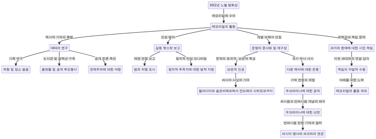 이 구조도는 얀 라친스키가 메모리얼을 대표하여 진행한 2022년 노벨평화상 강연에서 제시된 주요 개념과 관계를 담고 있습니다. 이 다이어그램은 메모리얼에 대한 노벨평화상 수여로 시작하여 메모리얼의 주요 활동 영역인 역사적 기억의 확립과 인권 옹호라는 두 가지로 나뉩니다. 이 다이어그램은 대테러 연구, 분쟁 핫스팟 보고, 개별 희생자 인정 등 이 두 영역에서 이루어지는 다양한 활동과 노력을 자세히 살펴봅니다. 또한 이 도표는 메모리얼이 다루는 문제의 초국가적 성격, 기억 전쟁의 위험한 결과, 과거와 현재에 대한 시민적 책임의 중요성을 강조합니다.