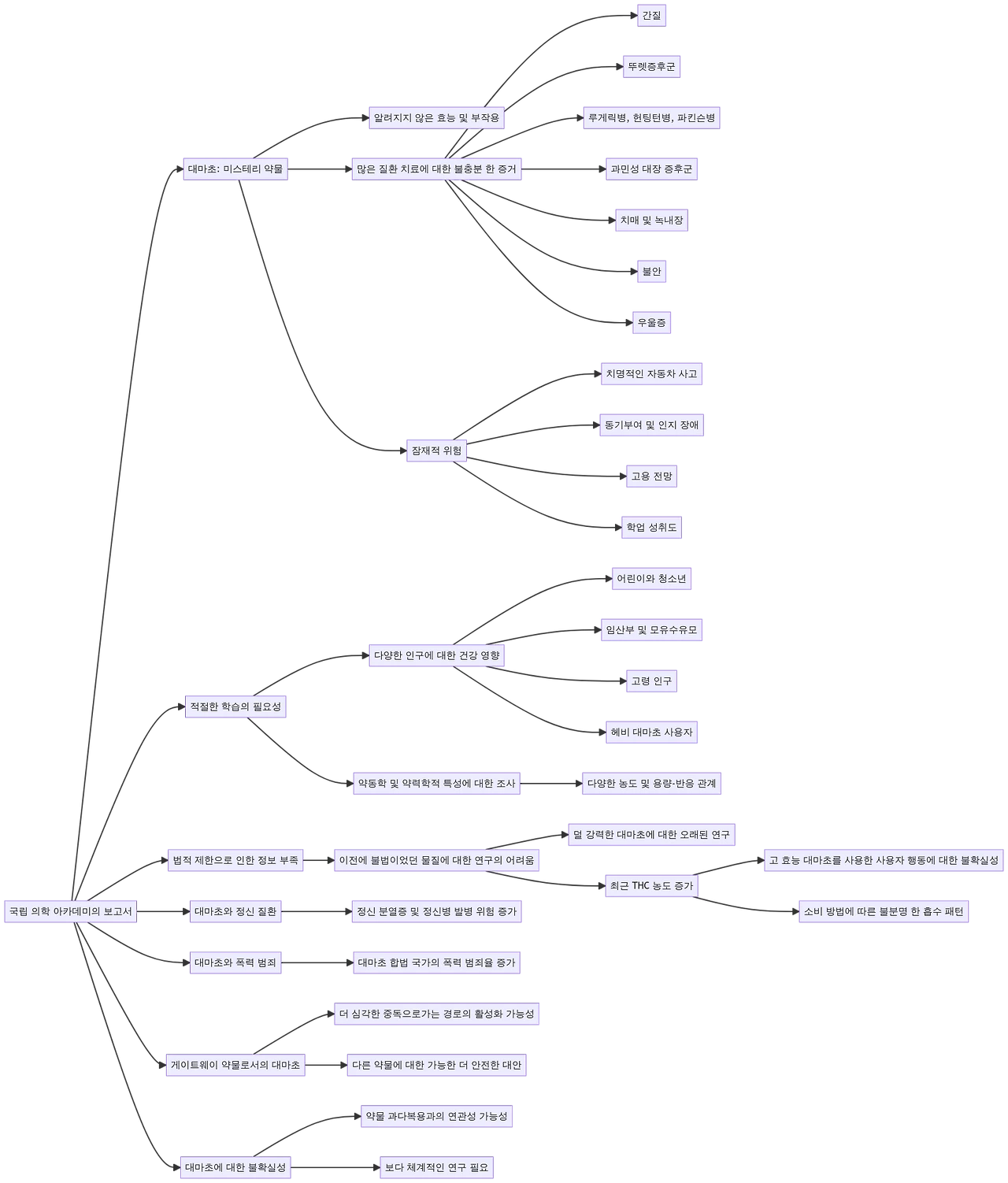부족하다는 점, 치명적인 교통사고, 인지 및 동기 부여 장애와 같은 잠재적 위험, 다양한 인구에 미치는 영향을 조사할 필요성 등이 있습니다. 이 보고서는 또한 법적 제한으로 인한 정보 부족, 덜 강력한 대마초에 대한 오래된 연구, 최근의 THC 농도 증가에 대해서도 강조합니다. 다른 주요 노드에서는 대마초 사용과 정신 질환, 폭력 범죄, 관문 약물로서의 잠재력 사이의 연관성을 보여줍니다. 이 다이어그램은 대마초에 대한 불확실성이 만연해 있으며 보다 체계적인 연구가 필요하다는 점을 강조합니다.