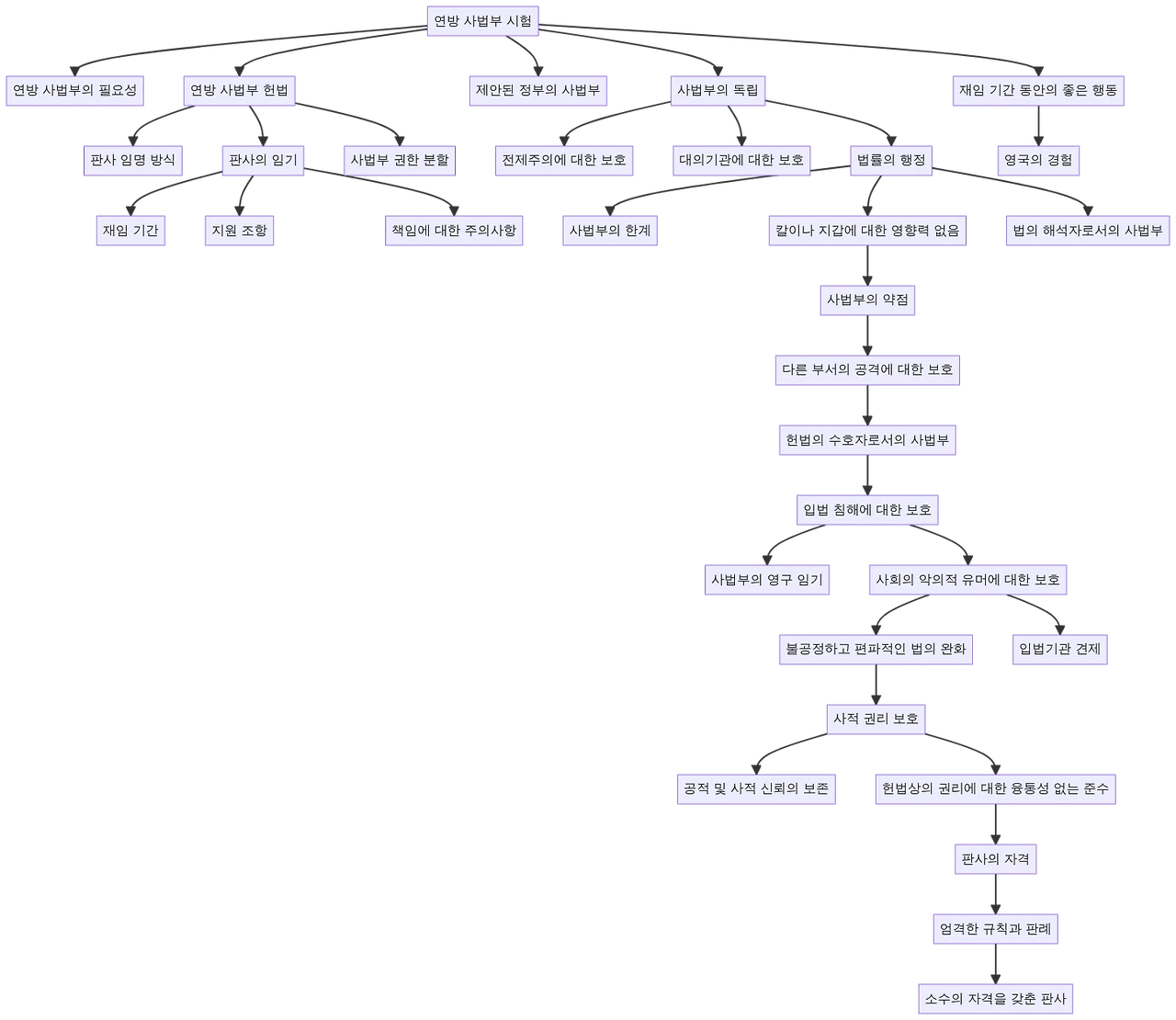 위 다이어그램은 이 백서의 주요 요점과 상호 연관성을 보여줍니다. 노드는 핵심 개념을 나타내고 링크는 논리적 및 개념적 관계를 나타냅니다. 예를 들어, "독재에 대한 보호" 노드는 "사법부의 독립" 노드와 연결되어 있으며, 이는 사법부의 독립이 독재에 대한 안전장치로 간주됨을 나타냅니다. "사법부의 영구 임기" 노드는 "입법 침해로부터의 보호" 노드와 연결되어 있으며, 이는 영구 임기가 입법부의 간섭으로부터 사법부를 보호하는 수단으로 간주됨을 보여줍니다. 이 다이어그램은 해밀턴의 복잡한 주장을 시각적으로 표현하여 가장 중요한 요점과 그 상호 연관성을 강조합니다.