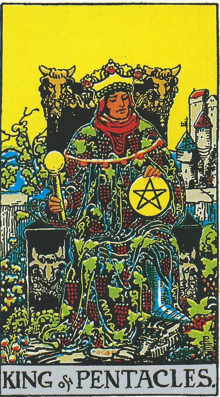 포도나무가 그려진 그의 의상은 풍요로운 분위기를 풍긴다. 왼손에 쥔 펜타클은 얼마든지 물질을 만들어 낼 수 있다는 자신감을 보여준다. 펜타클의 왕이 만들어낸 부유함은 그가 눈을 감고 내면으로 들어가는 과정에서 만들어낸 산물로 보인다. 자신이 할 수 있고 사랑하는 일을 통해 주변 사람들이 편안해질 수 있도록 좋은 영향력을 끼치고 있다.