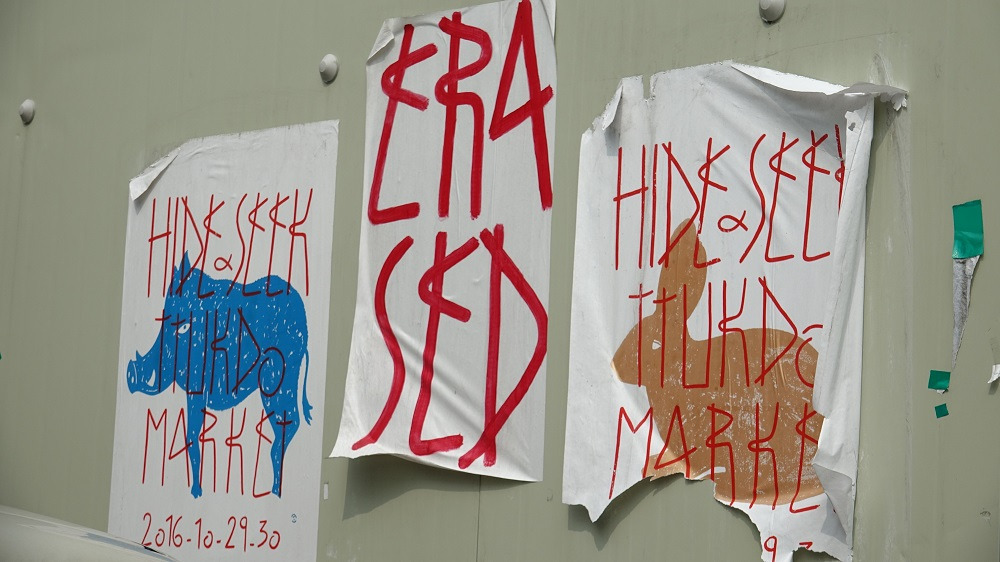 먼저, 3번 출구에서 바로 보이는 길을 걷다가 왼쪽 골목으로 들어갔다. 그리고 다시 오른쪽으로 꺾었다. 중심 길 한 블록 뒤에서 성수동을 보고 싶었다. 자동차 공업소 몇 개를 지났다. 그러다 포스터를 발견했다. 예술시장 느낌이 물씬 나는 포스터였다. 공장지대와 예술이 공존하고 있다는 게 느껴지는 순간이었다.