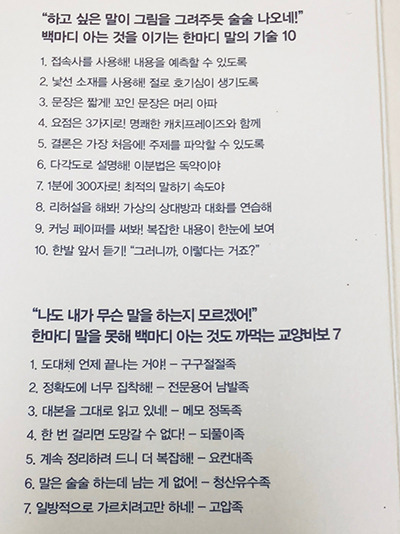 하지만 설명하기의 기술을 체계적으로 정리해본 적이 없다면 도움이 되지 않을까 싶다. 이 책을 읽으며 머릿속에 파편 파편 말하기 기술에 대한 정보를 정리해볼 수 있었다. 그것이 자기 계발서의 재미이자 매력이 아닐까 한다. 그리고 이 책을 통해 내가 지향해야 할 어떤 이미지도 생기지 않았나. 교양 바보가 아닌 ‘교양인’이라는 이미지 말이다. 말하기에 대해 고민이 많다면 한 번쯤 눈길을 줘보는 것도 어떨까 싶다.