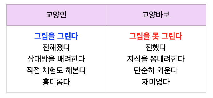 이 책의 2장과 3장에서는 교양인과 교양 바보의 말하기 특징을 설명하고 있다. 아래의 그림 중 교양인의 말하기 방법은 우리가 익혀야 할 것. 교양 바보의 말하기 방법은 우리가 피해야 할 것이다. 만약 서두에 얘기했던 발표에 서투른 사람이라면 교양 바보의 특징은 피해 가고, 교양인의 특징을 배워야 할 것이다.