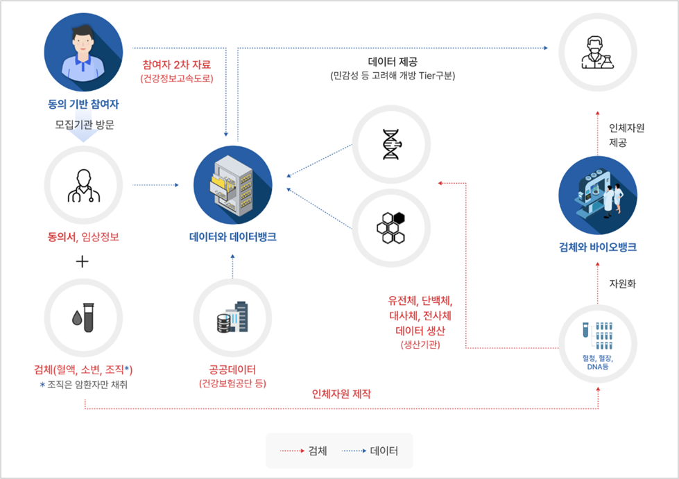‘국가통합바이오빅데이터구축사업’은 2032년까지 한국인 100만명의 통합 바이오 빅데이터를 구축하는 것이 목표라고 합니다. 홈페이지 소개된 사업 흐름을 보니 혈액과 소변 외에 조직도 채취하는 것으로 되어 있는데, 조직은 암환자만 채취합니다. 참여시 작성한 정보제공동의서에 따라 건강보험공단의 공공데이터, 의무기록, 개인보유 건강기록이 데이터 뱅크로 함께 제공됩니다.