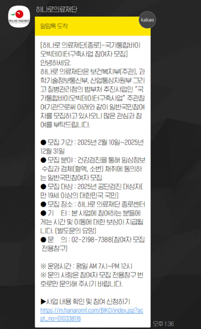 건강검진 예정이시거나, 병원에 가실 일이 있는 분들은 미리 알아보시고 참여하시면 좋을 것 같습니다. ‘국가통합바이오빅데이터구축사업’의 공익적 취지에 공감하신다면 참여하시고 현금 5만원 보상도 챙겨보세요.