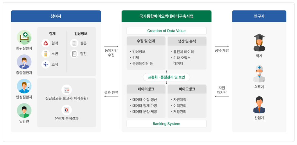 ‘국가통합바이오빅데이터구축사업’은 인체유래물은행을 구축하는 국가 주도 사업입니다. 인체유래물이란 혈액, 소변 같은 것들 말하는데요, 인체유래물은행은 이러한 것들을 모아서 데이터화하는 기관으로 바이오산업 혁신을 위한 다양한 연구에 활용됩니다.