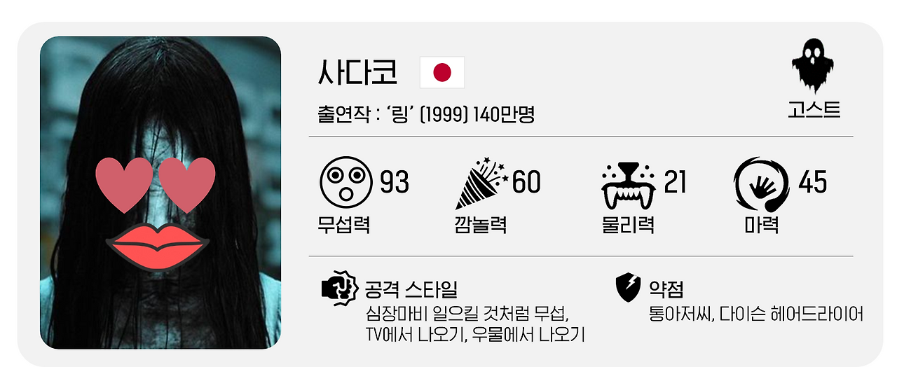 "내가 천마고속 상무로 있는 사람인데"라는 자기소개가 인상적이었던 '부산행'의 빌런 용석. 그가 좀비화하여 출전했다. 상대는 '링'에서 놀라운 등장 스킬을 선보였던 '사다코'이다. 우물이나 TV속에 숨어있다가 천천히 기어 나와 놀래키는 특기를 가지고 있으며, 몸을 접어 좁은 공간에 들어가는 기술에 나름 부심을 갖고 있다. 수줍음이 많아 항상 긴 머리로 얼굴을 가리곤 한다.