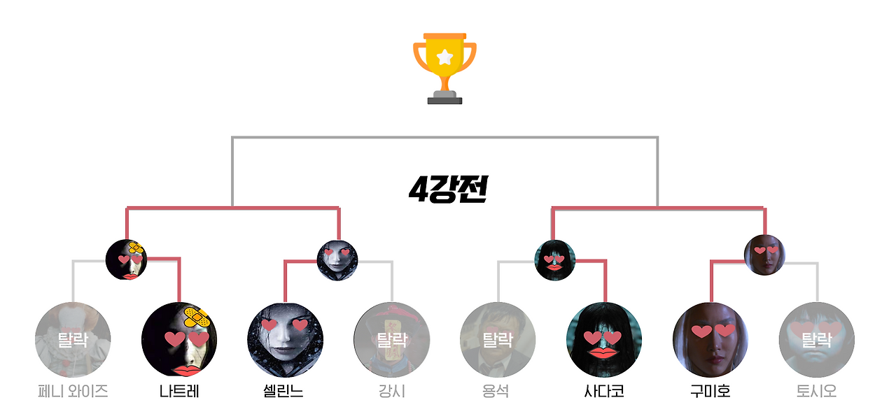 어찌어찌하다 보니, 남성 캐릭터들은 전부 탈락하고 여성 캐릭터들만 4강으로 진출했다.