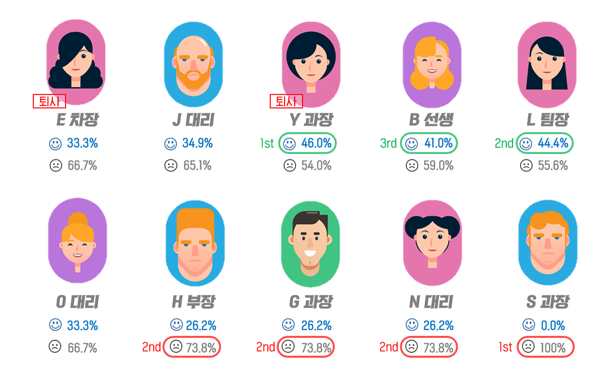 퇴사할 당첨금으로 15억, 10억으로 응답한 2명은 17억 원의 당첨금을 받으면 퇴사하리라는 것을 예상할 수 있었다. 그리고, 각자 응답한 당첨금 사용처 ①~⑤에 따라 실제 당첨자들의 흥망 사례와 대조하여 흥할 확률과 망할 확률을 단순 계산하였다. 결과적으로 로또에 당첨되면 폭망할 가능성이 높은 사람은 S과장(100%)으로 나왔다. 그 뒤를 이어 N대리, G과장, H부장이 73.5%로 망할 확률 공동 2위를 차지했다. 반대로, 흥할 확률이 가능 높은 사람은 Y과장으로 46%였으며 그 뒤를 이어 L팀장(44.4%), B선생(41.0%)이 차지했다.