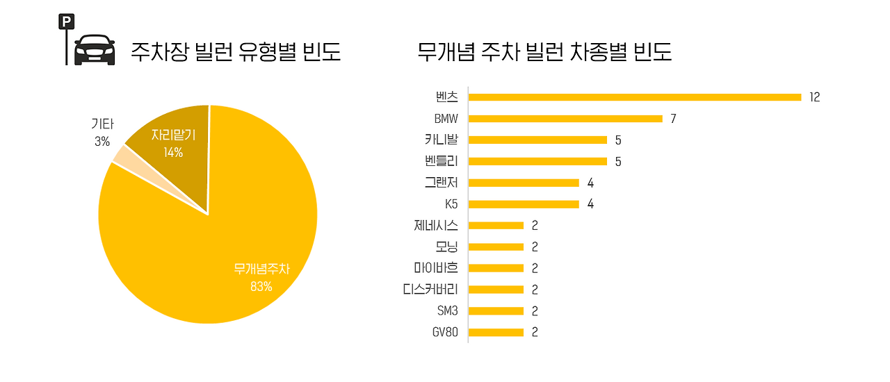 무개념 주차를 일삼는 빌런의 차종을 살펴보았더니 벤츠가 압도적으로 많았고, 그 뒤로 BMW, 벤틀리 등 고급차 브랜드와 카니발, 디스커버리, GV80 등과 같이 대형 차종들의 이름이 보였다. '내 차는 비싸니까', '내 차는 크니까' 주차 자리를 여러 개 사용해도 된다는 미친 생각을 갖고 있는 빌런들이다. 이런 빌런들은 어차피 뇌를 사용하지 않을 거라면 적출해서 침팬지에게 이식하는 것이 낫겠다.