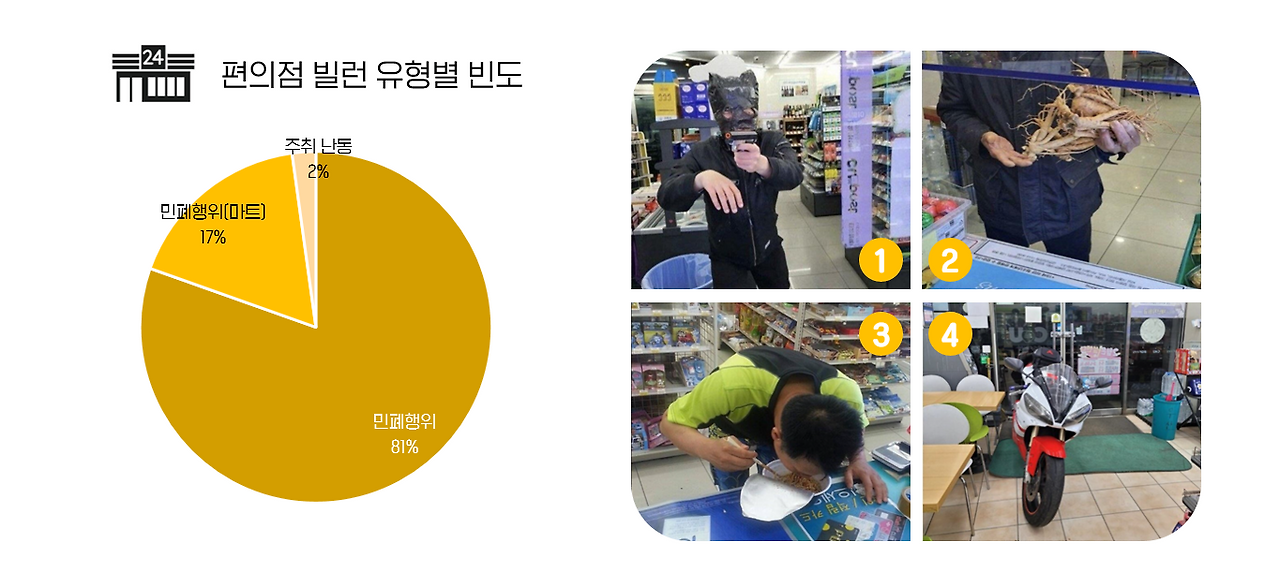 편의점에서 벌어지는 빌런의 만행들은 참으로 창의력이 뛰어나다는 생각을 하게 된다. 발생 비율로 보면 주로 민폐행위에 해당하는 것들이지만 편의점 알바생들의 스트레스를 극한으로 끌어올린다. 비둘기를 잡아오거나 인삼을 가져와서는 담배랑 바꿔달라고 하질 않나(사진②), 라면을 카운터에 가져와서 먹기도 하고(사진③), 자신이 타고 온 오토바이를 매장 안에 주차하기도 한다(사진④). 이런 창의력은 분명 연구와 노력이 뒷받침되었을 것으로 생각된다. 그것이 아니라면 편의점 알바에게 깊은 원한을 가진 것이 분명하다.