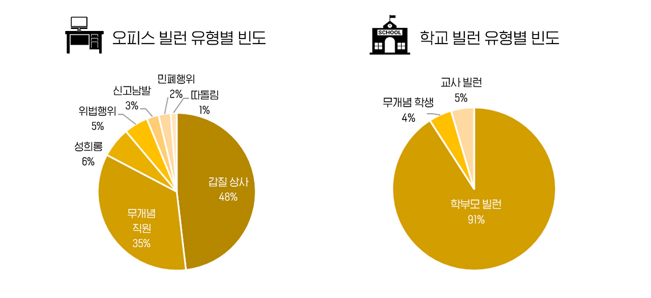 학교의 경우는 갑질과 막말을 자행하는 빌런이 학부모라는 단일 유형으로 집중되는 매우 특이한 현상이 나타났다. 최근 선생님들의 가슴 아픈 죽음과 이로 촉발된 전국 모든 선생님들의 분노의 목소리엔 이유가 있었다. 이제서야 '학부모 빌런'의 치명성이 만천하에 알려지게 된 것이다.