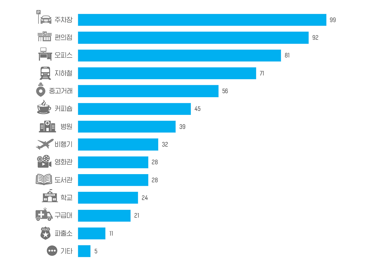 위 자료는 필자가 검색 엔진을 통해 알아본 빌런의 출몰 사례들을 장소별로 집계한 것이다. 빌런이 가장 많은 출몰 사례를 보인 장소로 꼽힌 1위 주차장, 2위 편의점의 경우는 사진 사례가 인터넷에 많이 존재한다. 반면, 3위 오피스의 경우는 텍스트로 이루어진 사연들이 많았으며, 간혹 카톡이나 문자 내역을 캡처한 이미지 정도가 있었다. 특히, 오피스의 경우 '블라인드'라는 플랫폼에 수많은 빌런 사례들이 있다는 것은 알고 있으나 그것을 일일이 다 찾아 반영할 수 없었다. 직장인 전용이기 때문에 재직회사의 이메일 등 인증을 통해서만 입장이 가능하고, 회사별 대화공간에서 거론된 사례은 양이 너무 많아 모두 집계할 수는 없었다.