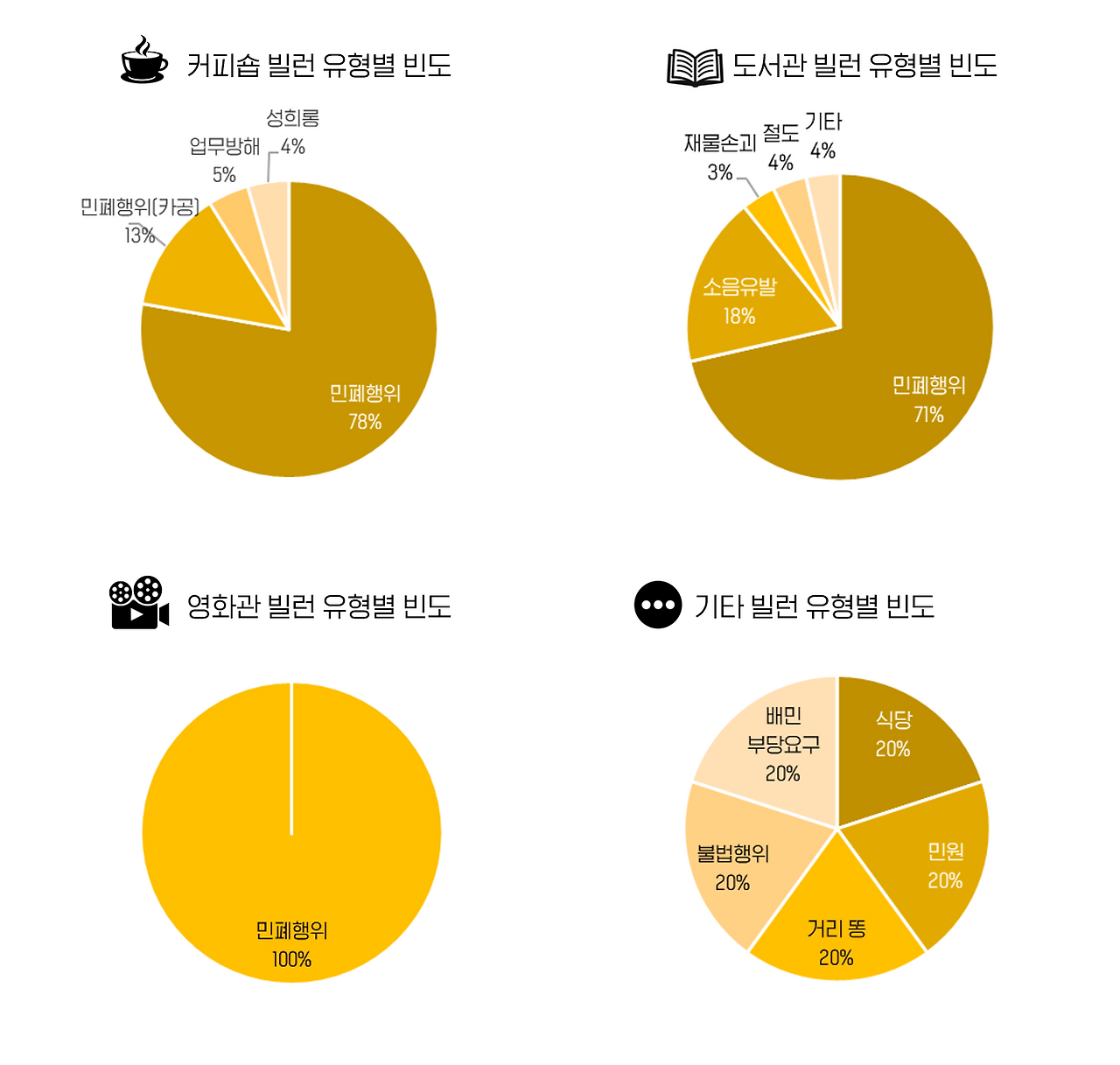 역시 많은 사람들이 함께 이용하는 다중 이용시설에서는 남에게 피해를 주는 '민폐행위' 유형의 빌런이 가장 많았다. 커피숍에서는 각종 진상들이 민폐행위를 일삼았지만 최근 보도된 ‘흡연 말리자 보란 듯이 커피를 테이블에 엎지르고 남은 커피를 패대기친' 중년 남성 2명이 많은 사람들의 공분을 샀다. 경찰이 업무방해 혐의로 수사하고 있다고 하니 꼭 처벌받았으면 좋겠다. 하지만 애초에 그런 짓을 저지르는 무개념 말종들이 처벌받는다고 한들 반성이나 할지 의문이다.