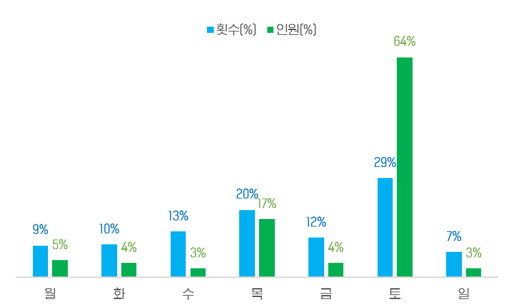 전형적으로 레저, 여행 패턴과 유사하다. 서울고속도로(일산-퇴계원 구간) 요일별 교통량 통계와 비교해 보았다.