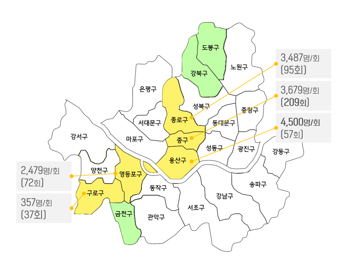 노란색으로 표시된 5개 구는 집회 신고 및 실시 횟수가 가장 많은 Top 5 구이다. 회당 평균 집회 인원은 용산, 중구, 종로, 영등포 순이었으며 평강제일교회가 에이스로 있는 구로구는 상대적으로 소규모 집회들이었던 것으로 볼 수 있다. 반면, 초록색으로 표시된 3개 구는 조사기간 (2023년 7월~9월) 중에는 단 한 번의 집회 신고도 없었던 청정 구역이다. 이들 3개 청정 구역의 공통점이나 특징을 찾아보려 부동산 평당 매매가 순위 등을 비교하였지만 상관관계를 나타내는 그 무엇도 발견할 수 없었다.