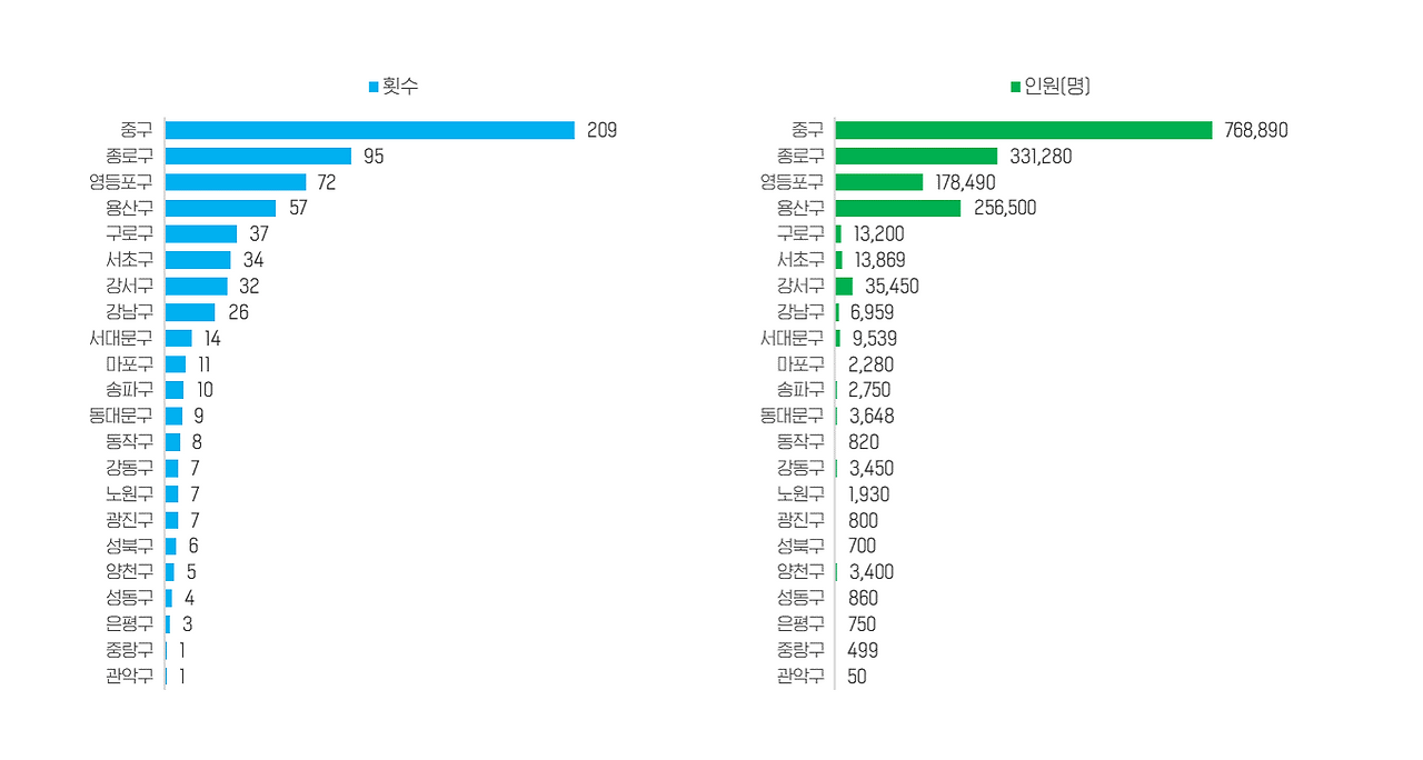 시청, 광화문, 세종대로, 정부종합청사 등이 위치해 있는 중구가 집회 신고 횟수나 인원 측면에서 압도적인 1위를 차지하였다. 종로구가 뒤를 이었지만 1위와는 격차가 크다. 윤석열 정부 출범 후 급부상한 용산도 눈에 뜨인다. 용산은 회당 집회 인원이 가장 많은 것으로 집계되었다. 그 외에 국회가 있는 여의도(영등포구), 평강제일교회가 있는 오류동(구로구), 법원과 검찰청이 있는 서초동(서초구)에서도 많은 집회가 이루어졌던 것으로 나타났다.