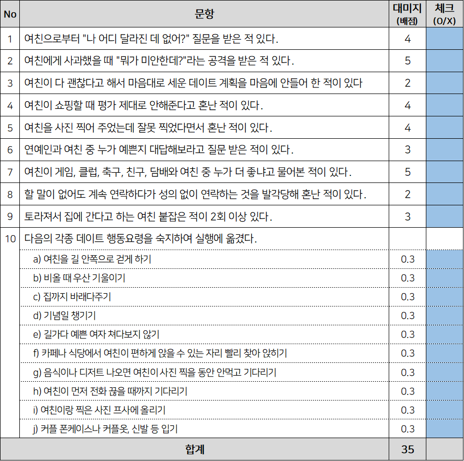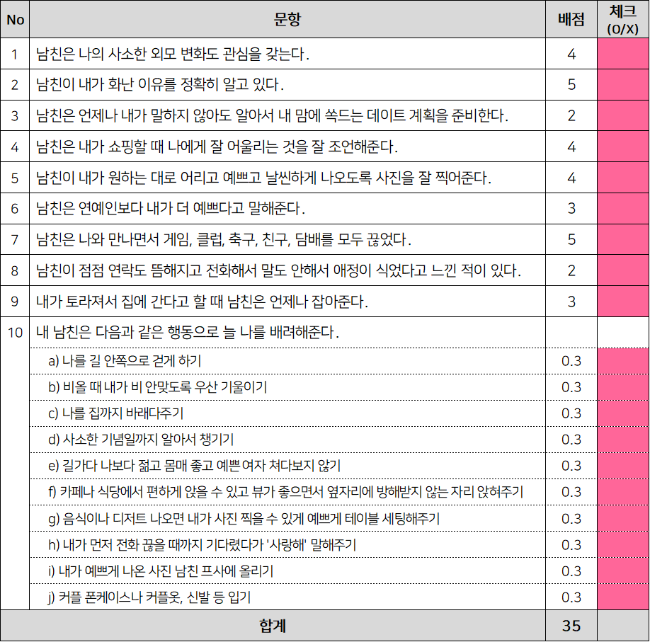 이렇게 웃겨보려고 마음대로 써본 아몰랑 보고서. 독자 참여형 콘텐츠로 만들어달라는 요청이 있어 무리수를 한 단계 더 두어보았다. 위에서 언급한 연인 간에 부여되는 임무를 가지고 과연 자신이 현재 혹은 과거의 연인에게 어떻게 대했는지를 되짚어 볼 수 있는 진단표를 만들었다.