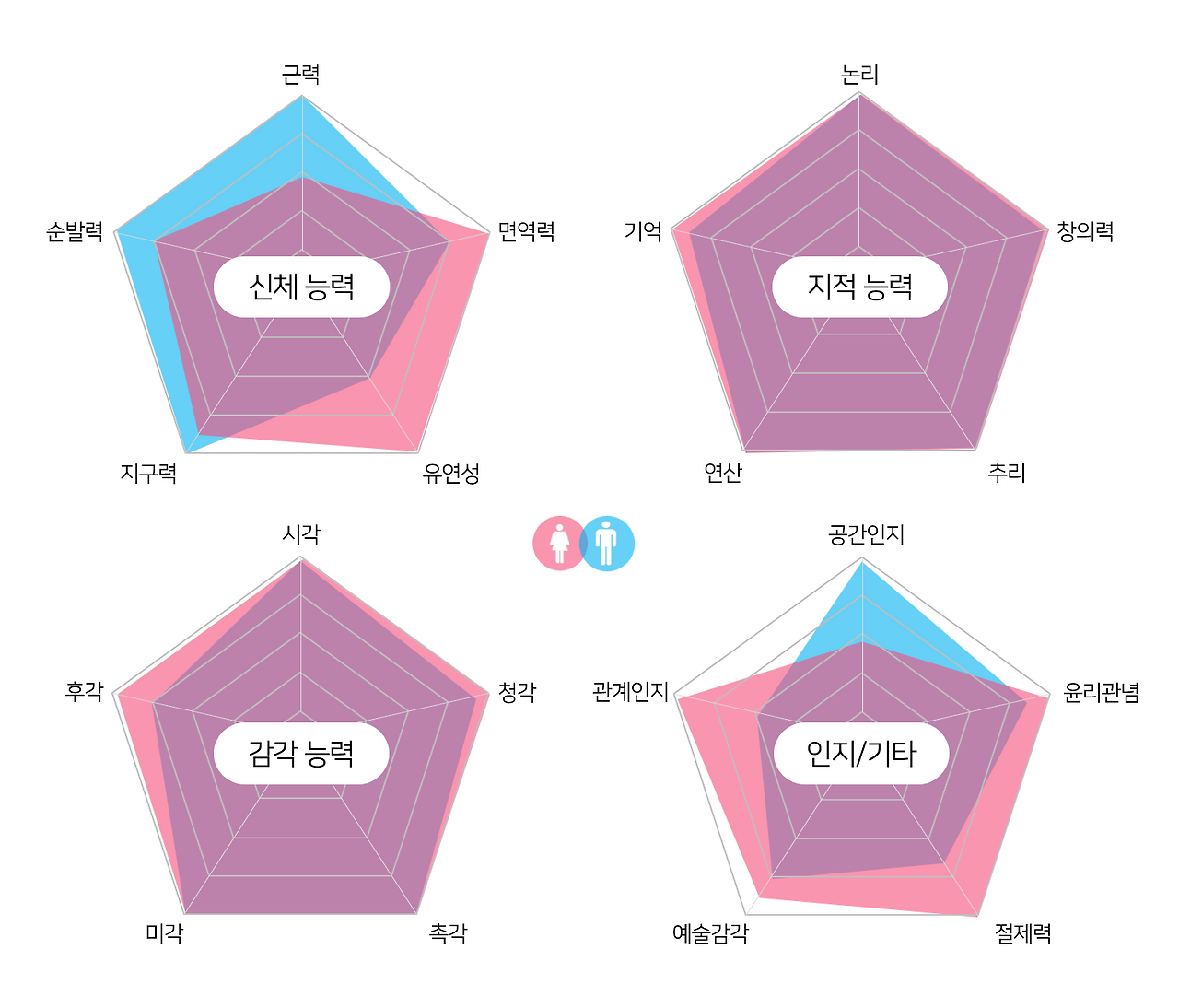 여성은 남성보다 공간 지각능력이 다소 약한 편이다. 길거리 김여사님들도 그러고 싶어서 그러는 것은 아니다. 반면, 남성은 예술감각과 절제력, 윤리관념에서 여성보다 낮은 경향이 있다.