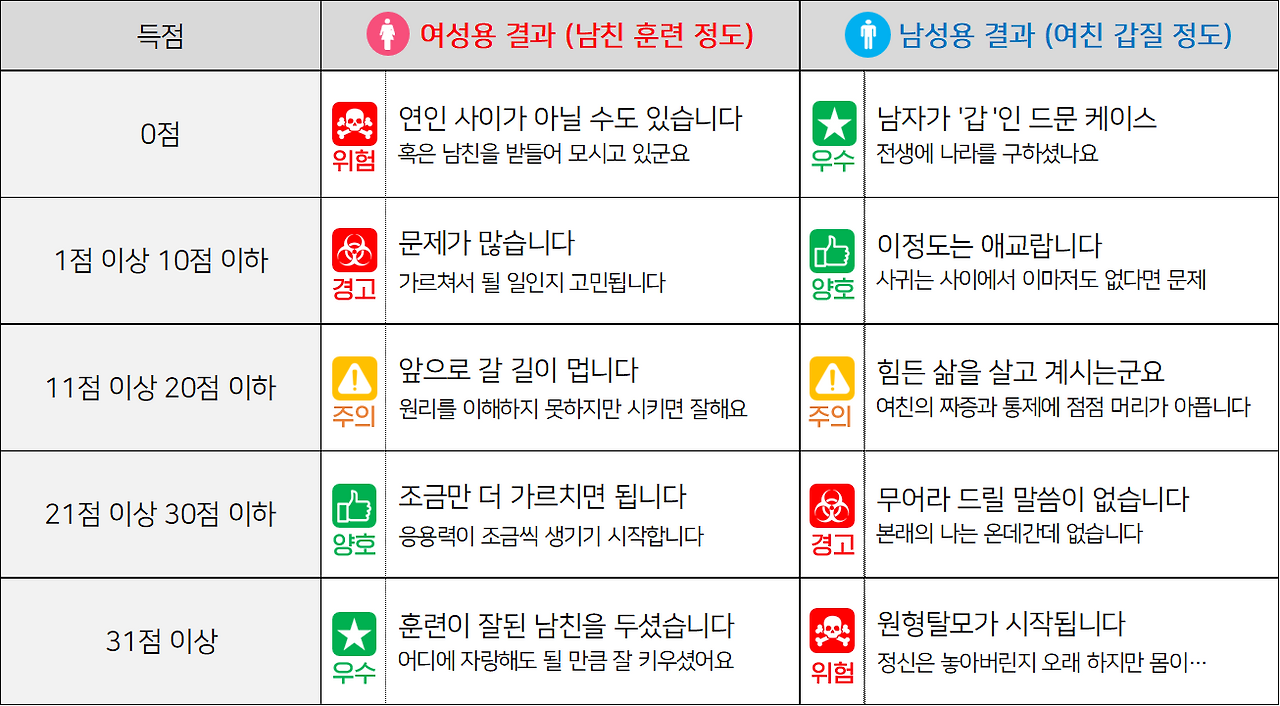 위의 성별에 따른 진단표를 체크해서 해당하는 점수를 합산하여 아래의 진단표에서 어느 구간에 해당하는지를 확인해 볼 수 있다.