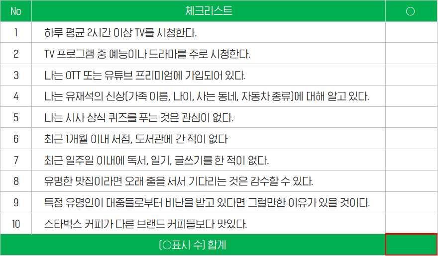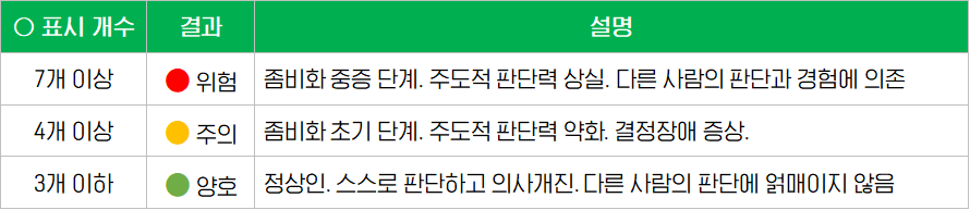 그래서 현재 자신의 좀비화가 얼마나 진행되었는지를 판단해 볼 수 있는 자가진단표를 만들어보았다. 아래에 제시된 10개의 문항을 읽고 자신에게 해당이 있는 경우 'O' 표시를 하고 그 개수를 합하여 붉은색 칸에 적으면 된다.