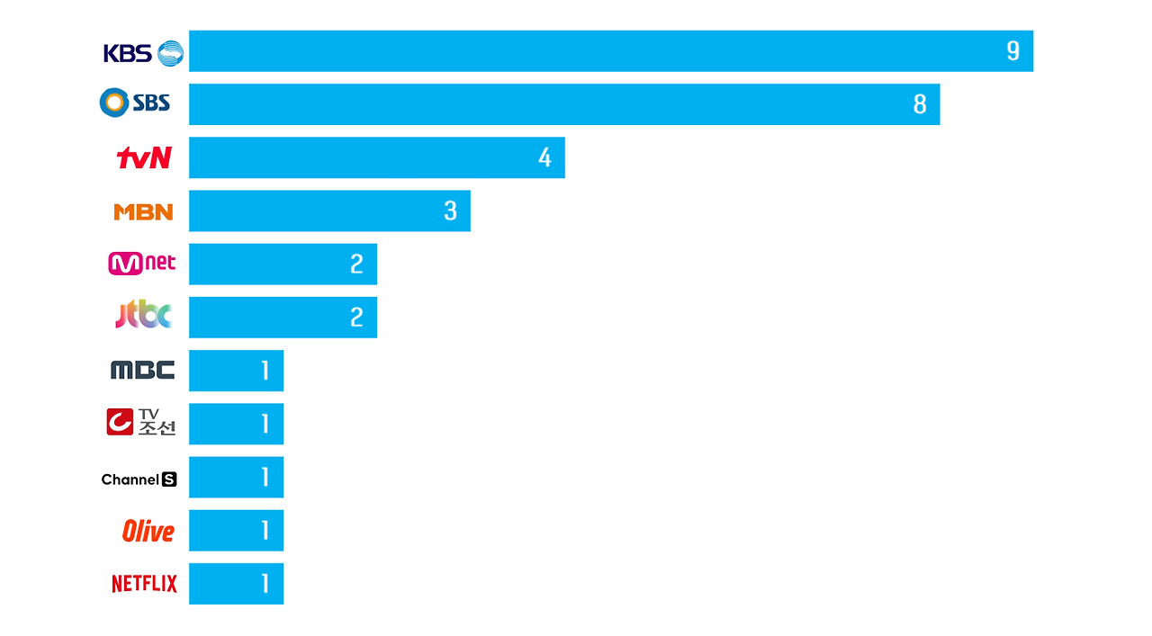 방송사별로 살펴보면 KBS, SBS, tvN 순으로 집계되었다. 가장 많은 주작 사례가 검색된 방송 프로그램은 KBS의 VJ특공대였으며 4건의 주작 사례가 검색되었다. 야구로 말하자면 멀티히트요, 농구로 말하자면 트리플더블에 해당하는 활약이다. 국영방송 KBS를 주작 1위 방송국으로 만들어준 효자 프로그램이라고 보아야겠다. VJ특공대만 아니었으면 SBS가 1위를 할 수 있었을 텐데 말이다. SBS로서는 아쉬운 일이다.