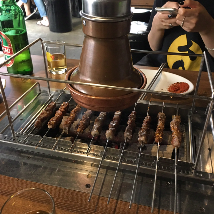 심양꼬치로 마무리. 양꼬치야 늘 맛있고. 제일 좋았던 하나는 맥주잔이다. 작아서 자꾸만 부어줘야 한다. 맥주를 가득 따랐다가, 반쯤 마시고 나면 저 노란색 마크에 맥주가 걸려 일출 같...