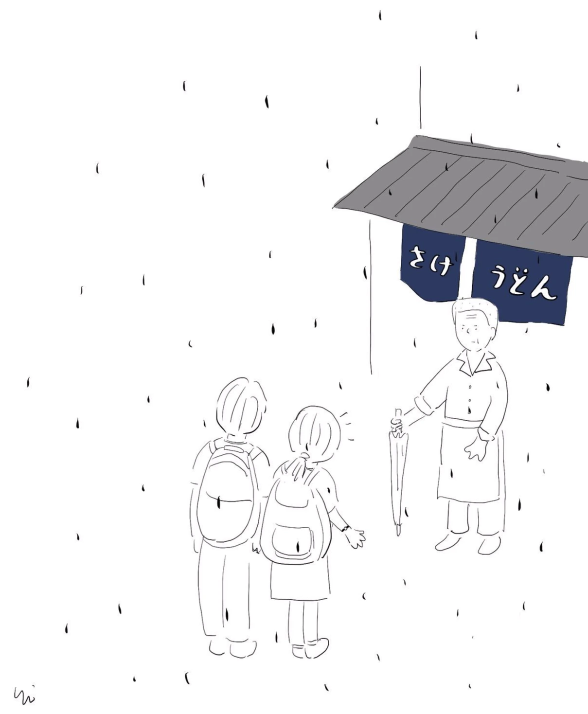 밥을 다 먹고 따뜻하게 몸을 데우고 나서도 비가 그칠 기미가 안 보여서 우리는 비를 맞으며 돌아가기로 하고 가게를 나섰다. 그런데 주인이 따라 나오더니 우산을 쓰윽 내밀었다. 역시나 한 마디 말도 없이.