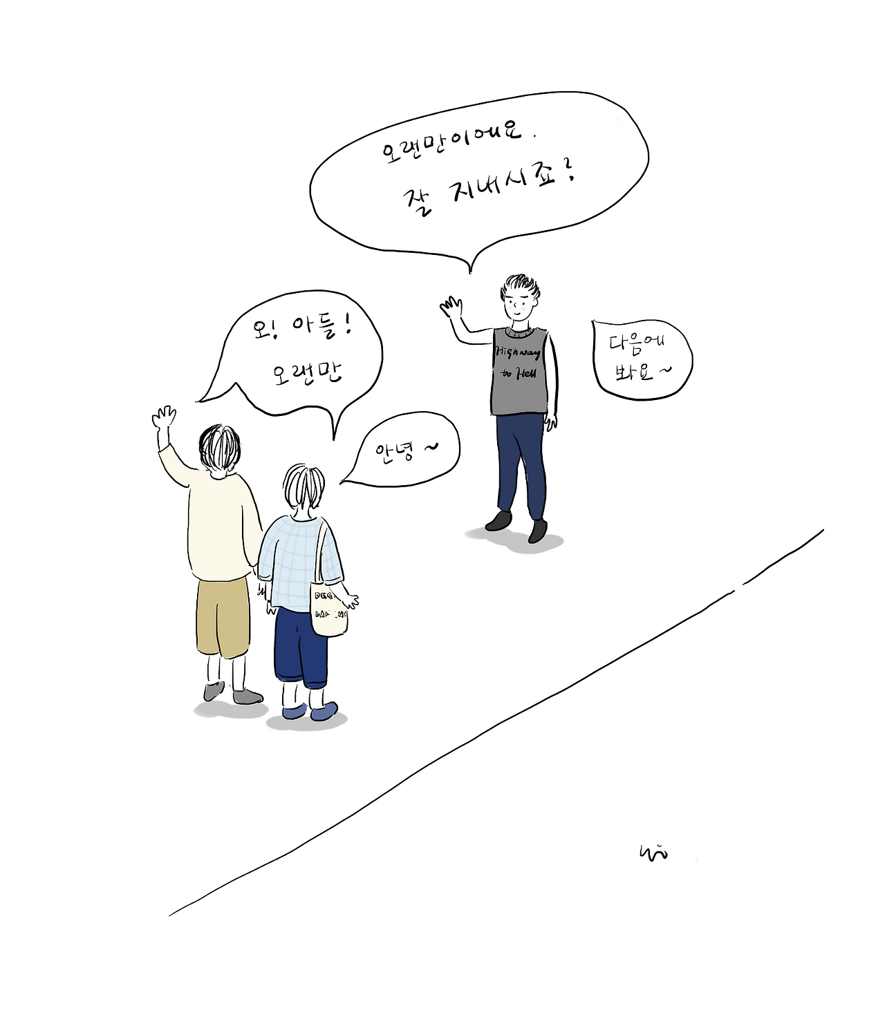 나중에 아들과 저렇게 지내고 싶었다. 길 가다 우연히 마주치면 반가이 인사와 안부를 나누고 총총 헤어지는 관계. 내가 좋아하지 않는 극강의 차림새(올백 머리에, 쫄바지에, 터프가이 나시, 거기다 문신까지)를 한 아들을 만나도 쿨하게 인사하고 헤어지는 장면을 생각해보곤 했다. 성인이 된 자녀(특히 결혼한 자녀)의 인생에 지나친 영향력을 행사하는 부모가 많은 우리 사회 분위기에 대한 반감이었을지도 모르겠다.