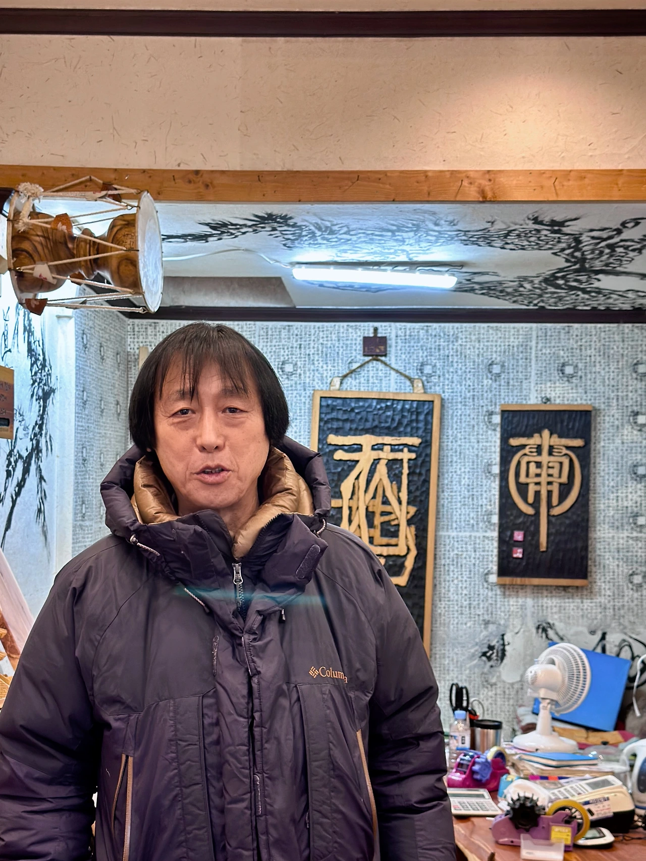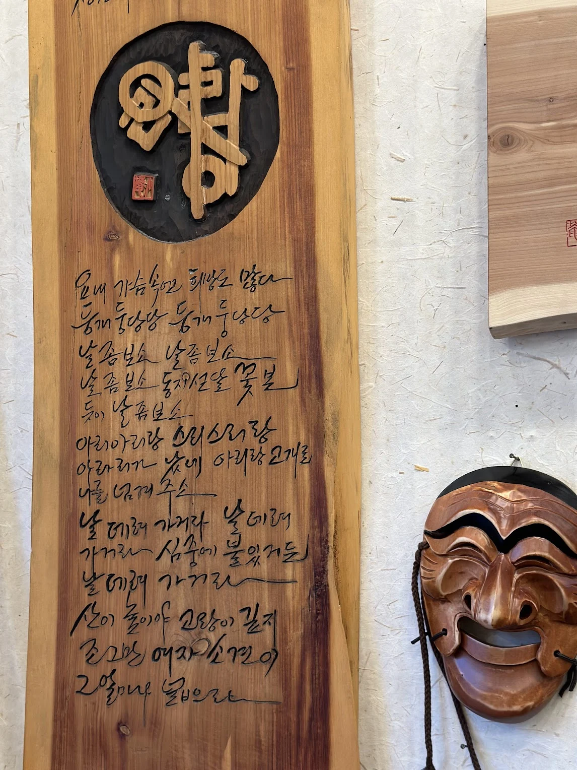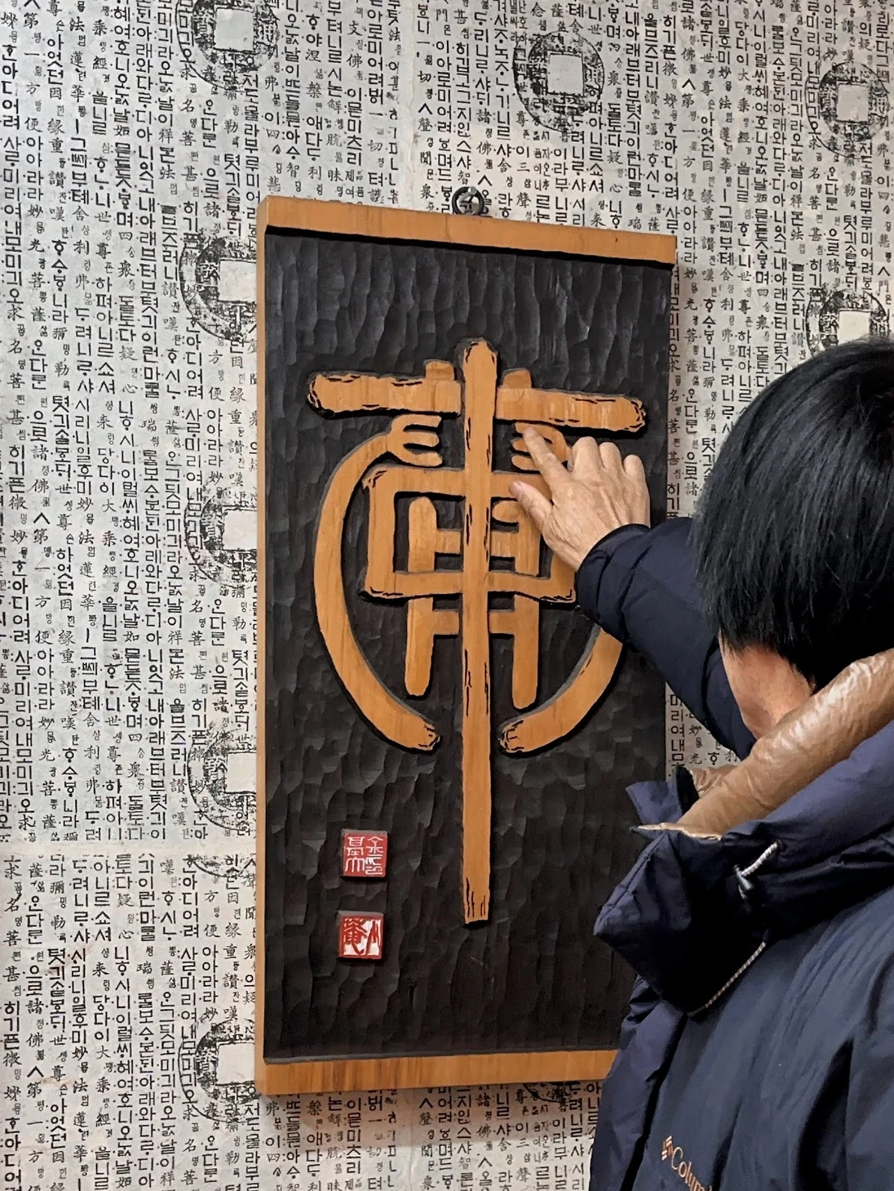 일본은 우리나라 '도'를 '현'이라고 불러. 97년에 지어졌어. 한국민속촌 같은 곳인데, 이 현판의 글씨도 내가 팠지. 한 가지 조건이 있어. 그냥 만든 걸 가져가는 건 안돼. 직접 일본 대사 앞에서 파는 걸 시연해야 했어.