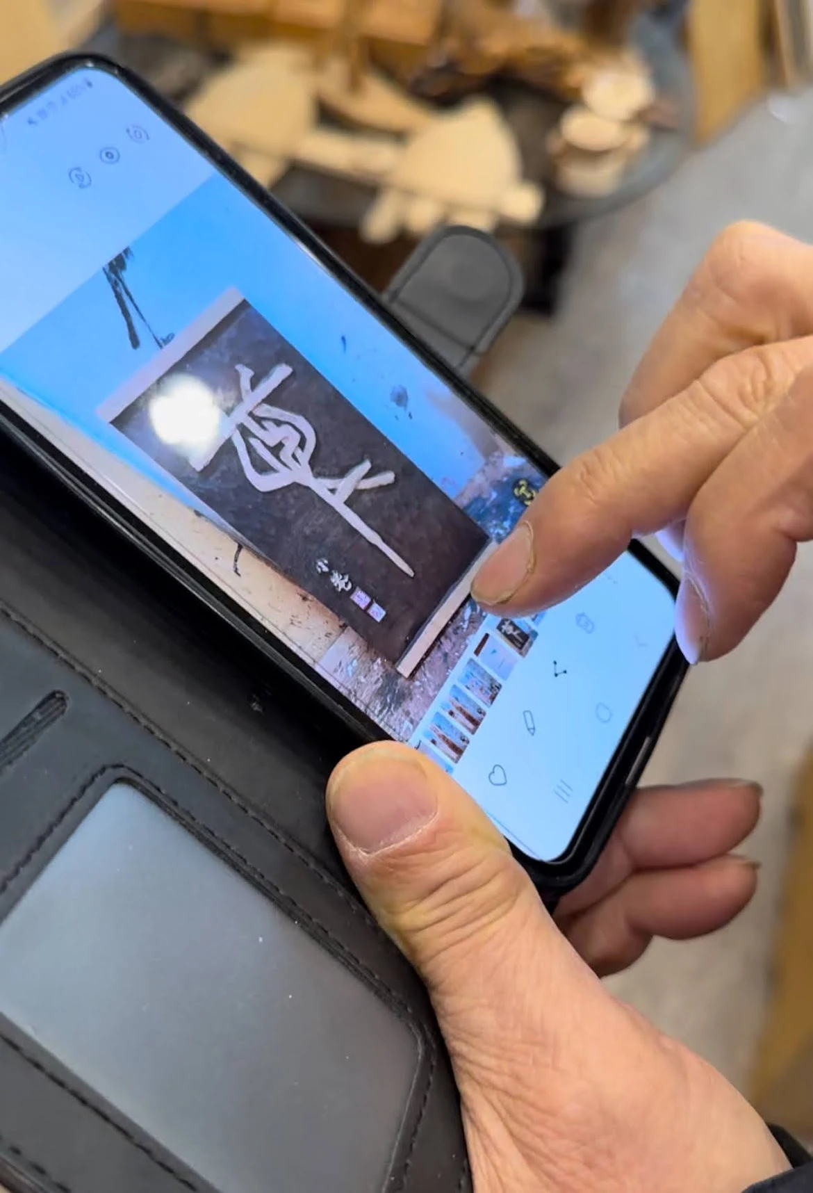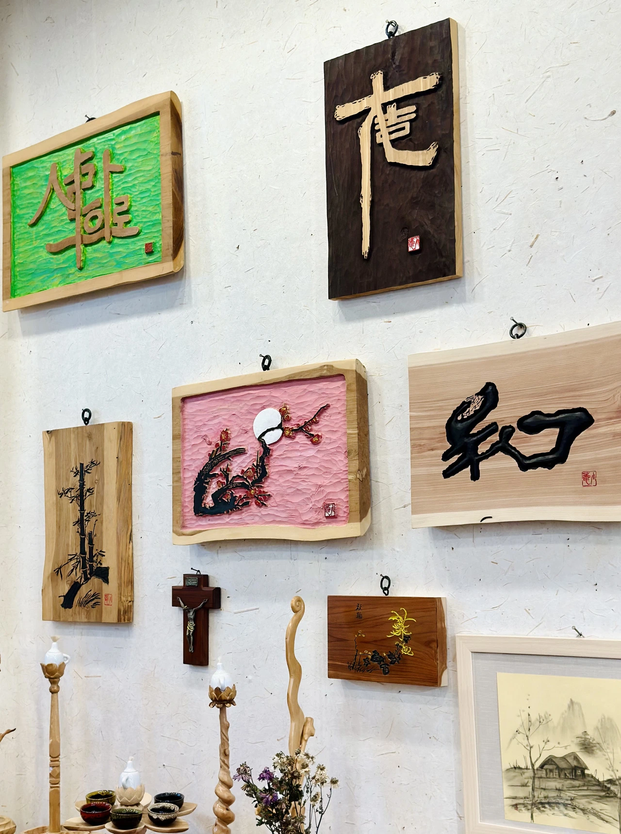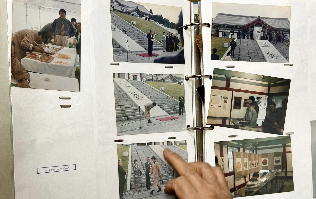 일본은 우리나라 '도'를 '현'이라고 불러. 97년에 지어졌어. 한국민속촌 같은 곳인데, 이 현판의 글씨도 내가 팠지. 한 가지 조건이 있어. 그냥 만든 걸 가져가는 건 안돼. 직접 일본 대사 앞에서 파는 걸 시연해야 했어.