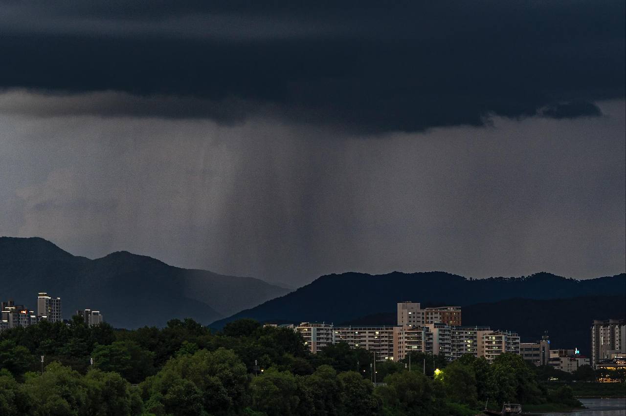 자전거를 타고 중도교 위를 달리며 집으로 돌아가던 길. 어둑해진 풍경을 헤치며 달리던 순간, 나는 결국 자전거를 멈추고 말았어. 회색빛 비의 커튼이 춘천의 뒷배경처럼 조용히 내려앉고 있었거든. 하늘과 땅 사이를 잇는 비구름의 장막을 그냥 지나칠 수는 없었지.